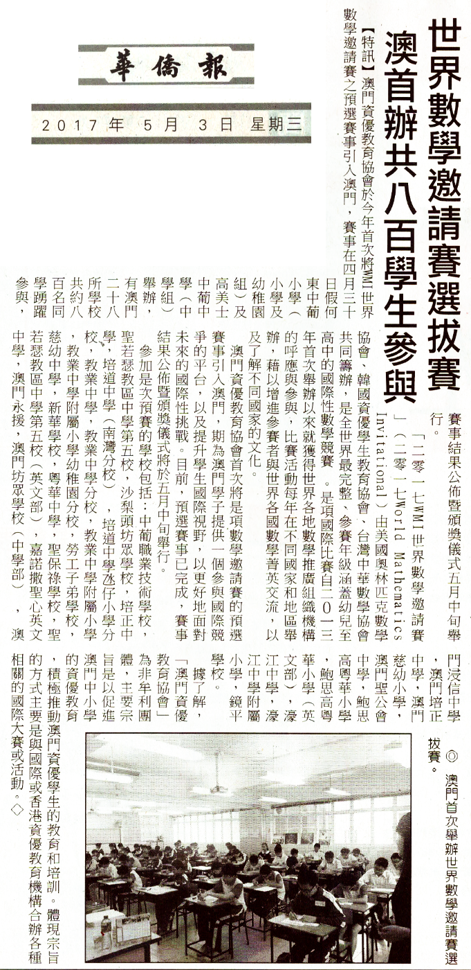2017 05 – 華僑報 – 世界數學邀請賽選拔賽 澳首辦共八百學生參與