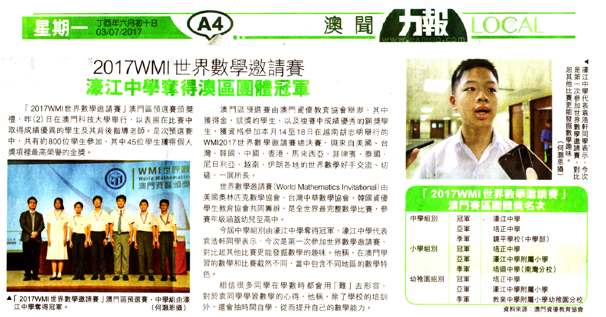 2017 07 – 力報 – 2017 WMI 世界數學邀請賽 濠江中學奪得澳區團體冠軍