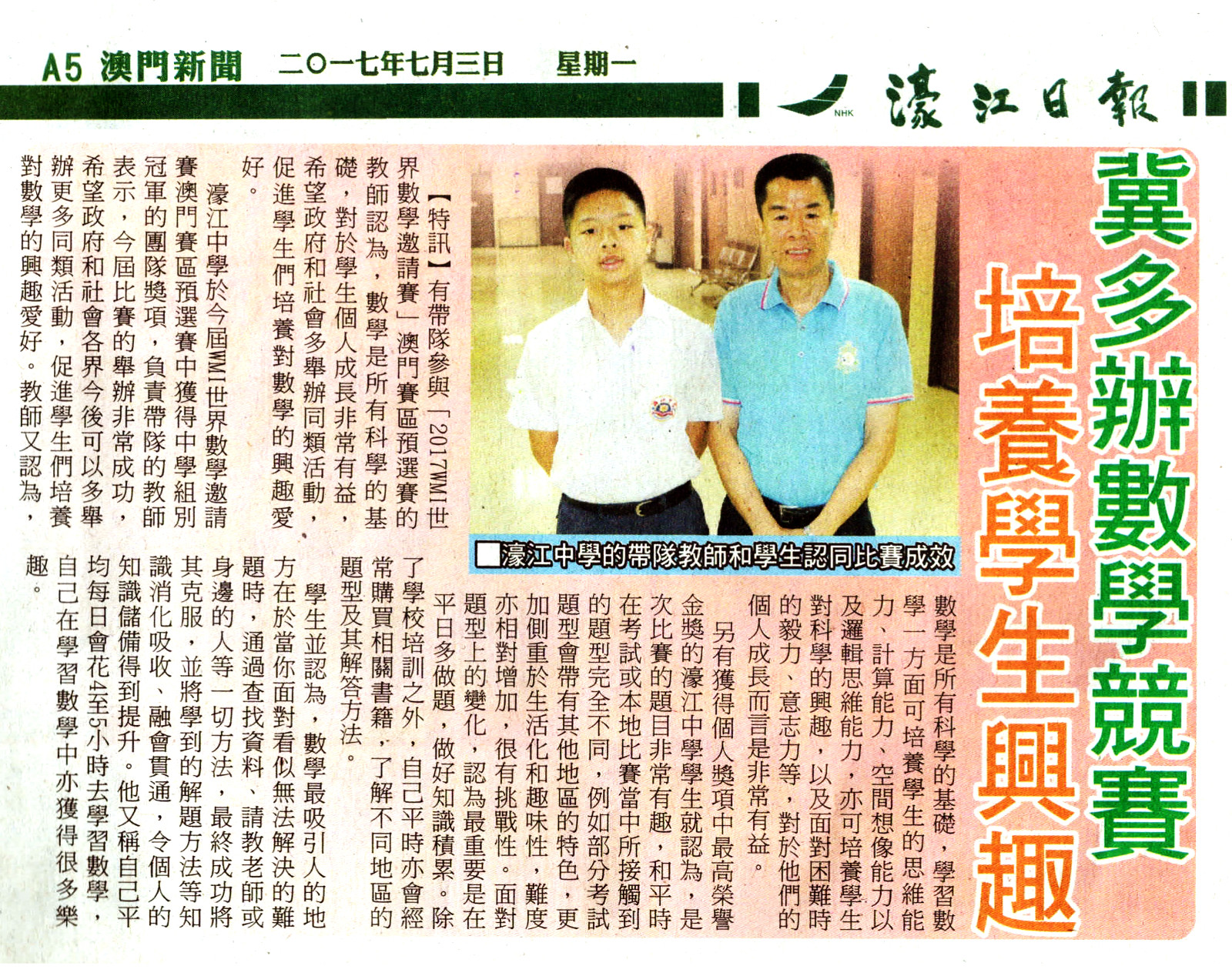 2017 07 – 力報 – 2017 WMI 世界數學邀請賽 濠江中學奪得澳區團體冠軍