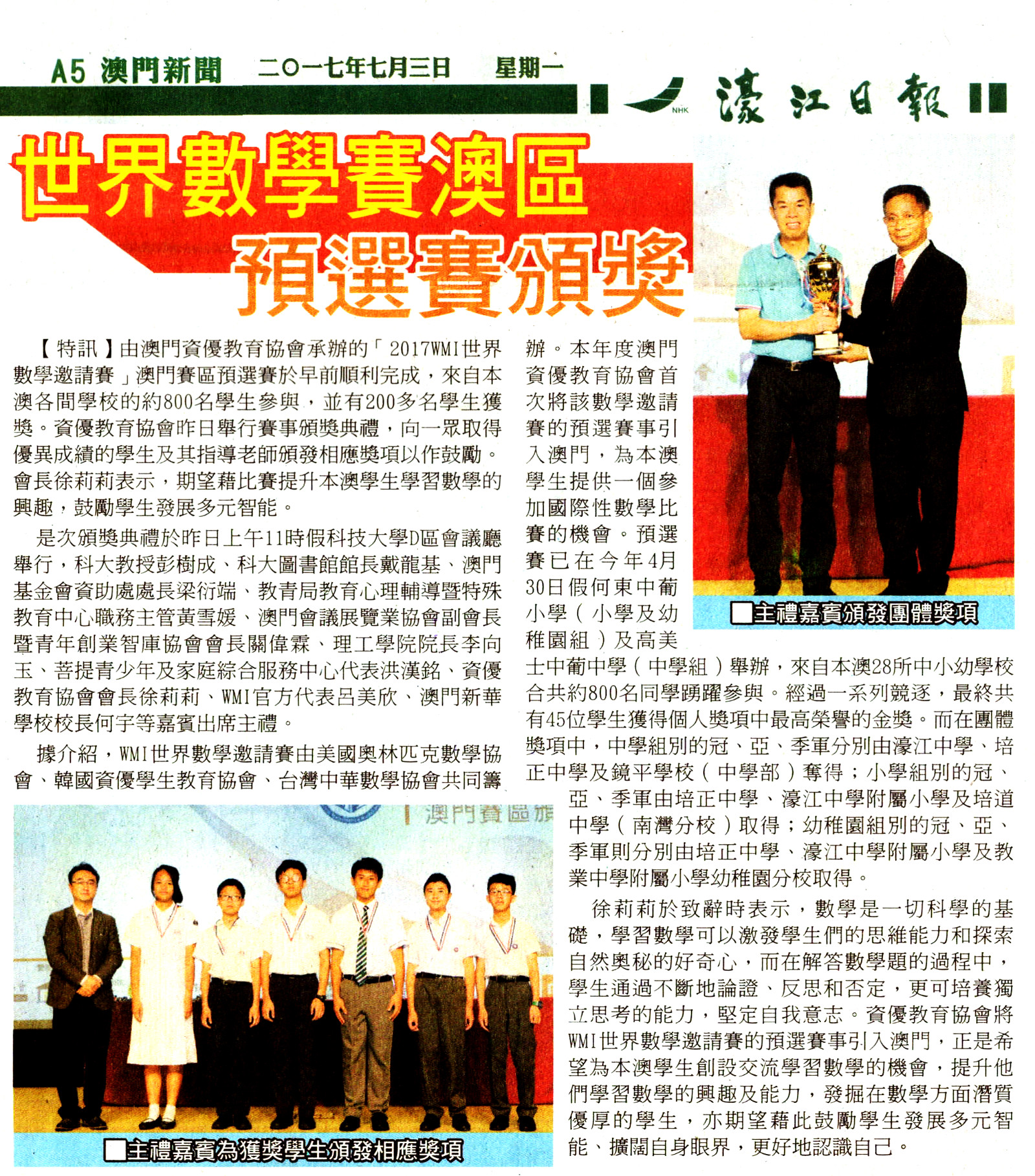 2017 07 – 濠江日報 – 世界數學澳賽區 預選賽頒獎