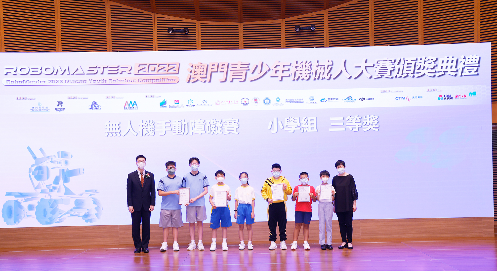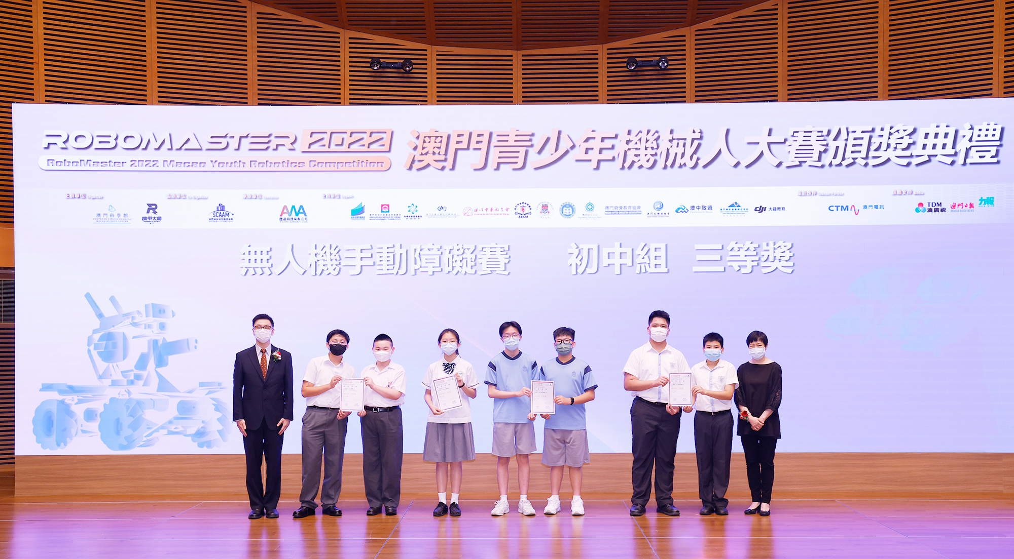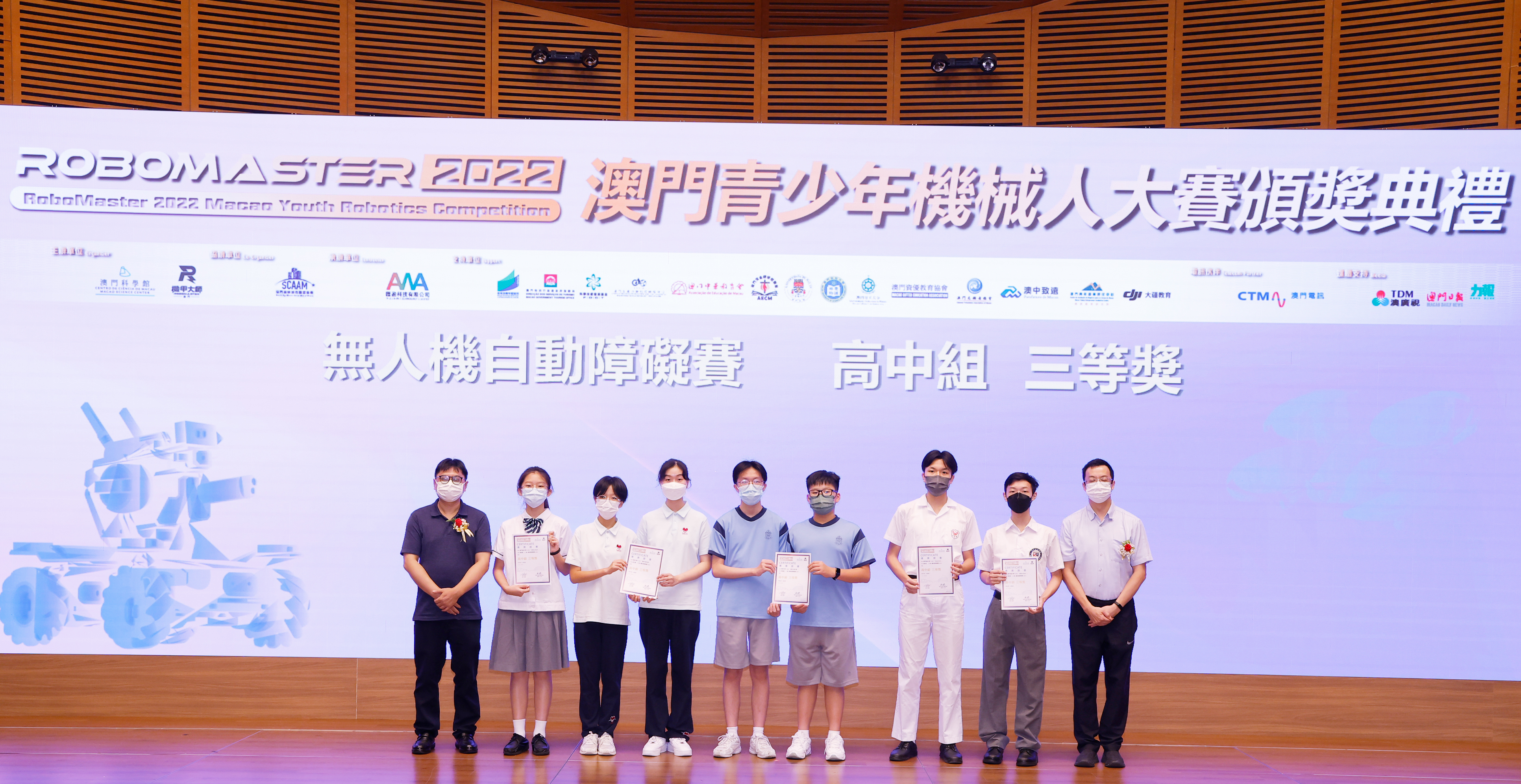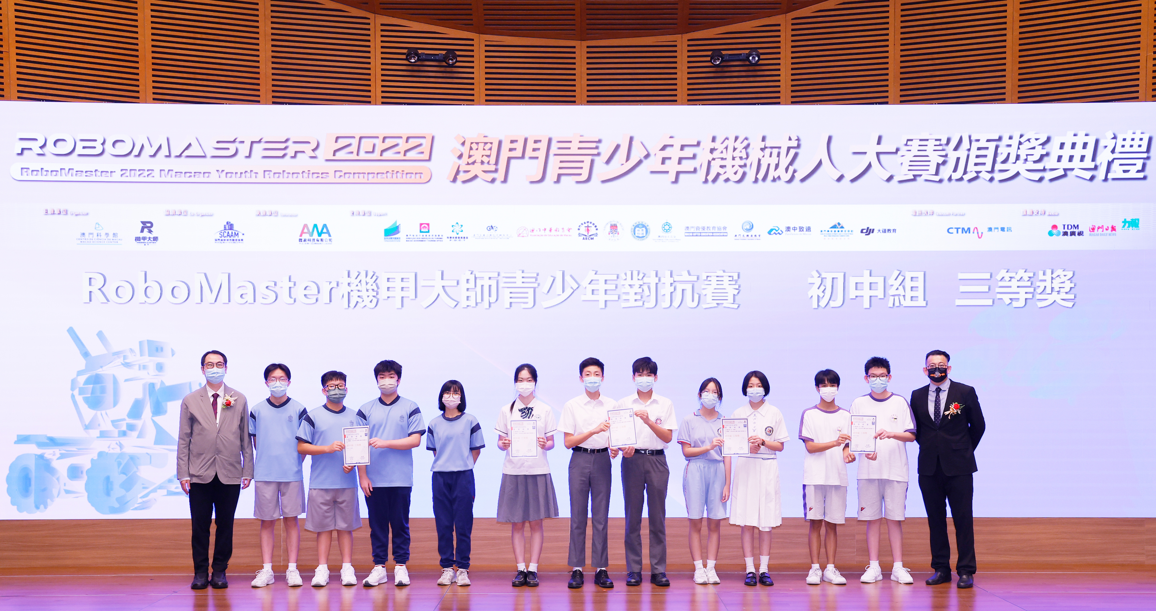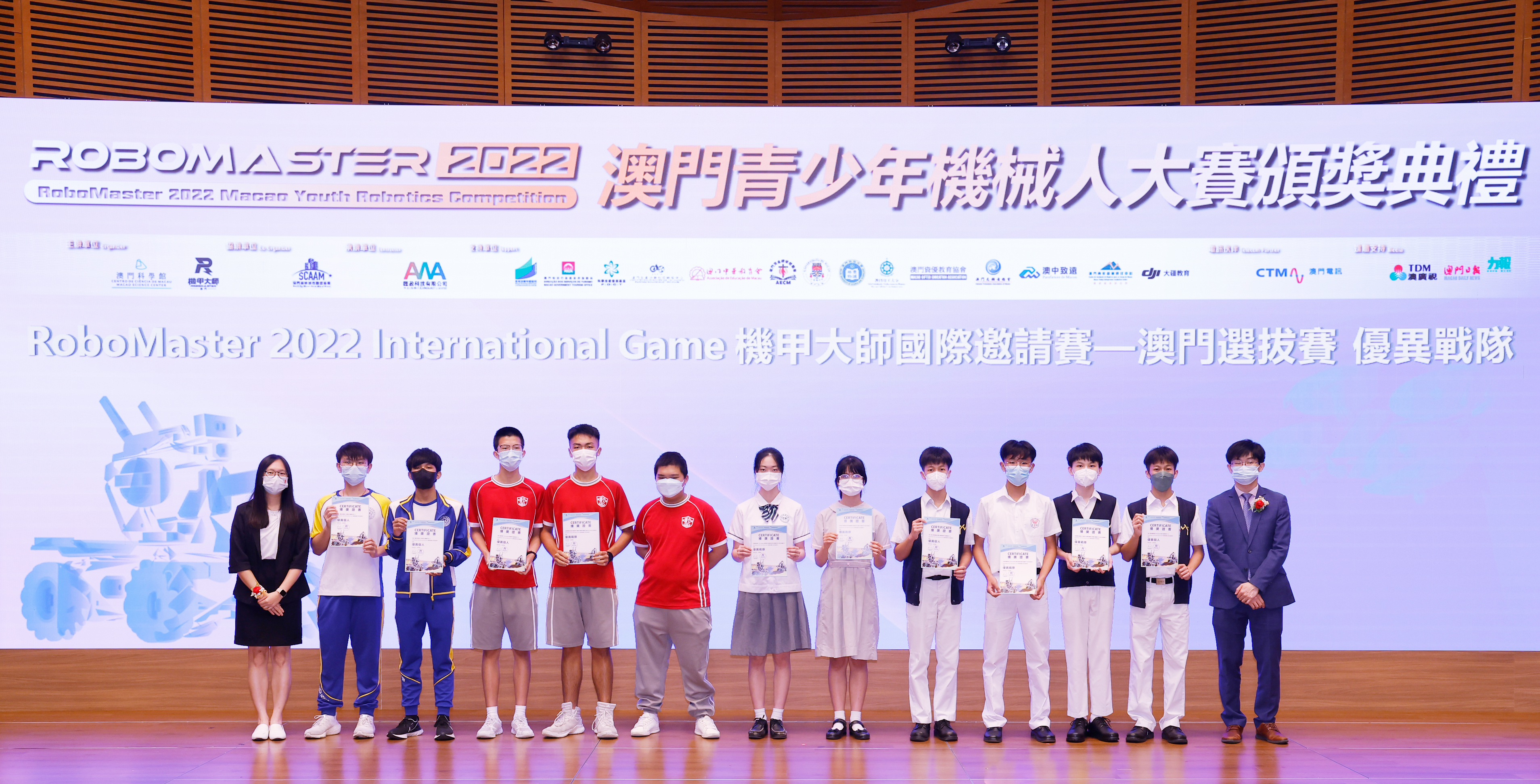 由澳門科學館和機甲大師澳門(國際)協會主辦,澳門智慧城市聯盟協會協辦,匯盈科技有限公司承辦的「RoboMaster 2022 澳門青少年機械人大賽」,在多個政府部門、機構和公司的大力支持,以及在澳門一眾學校領導及師生的積極參與和配合下,已於6月5日順利結束,並於今日在澳門科學館會議廳圓滿舉行頒獎典禮暨成果展,共23間學校約150名師生代表及優秀志願者等出席參與。本次賽事超過20間學校, 700余學生及老師參與不同賽項的競技中,通過比賽的形式為參賽隊員搭建一個全面機械人技術交流的平臺,形成濃厚的學術氛圍,他們在比賽中成長,在實踐中進步,並讓機械人競技和工程師文化進入大眾的視野,啟發更多懷有科技夢想的個人或群體,為地區科技創新發展助力。