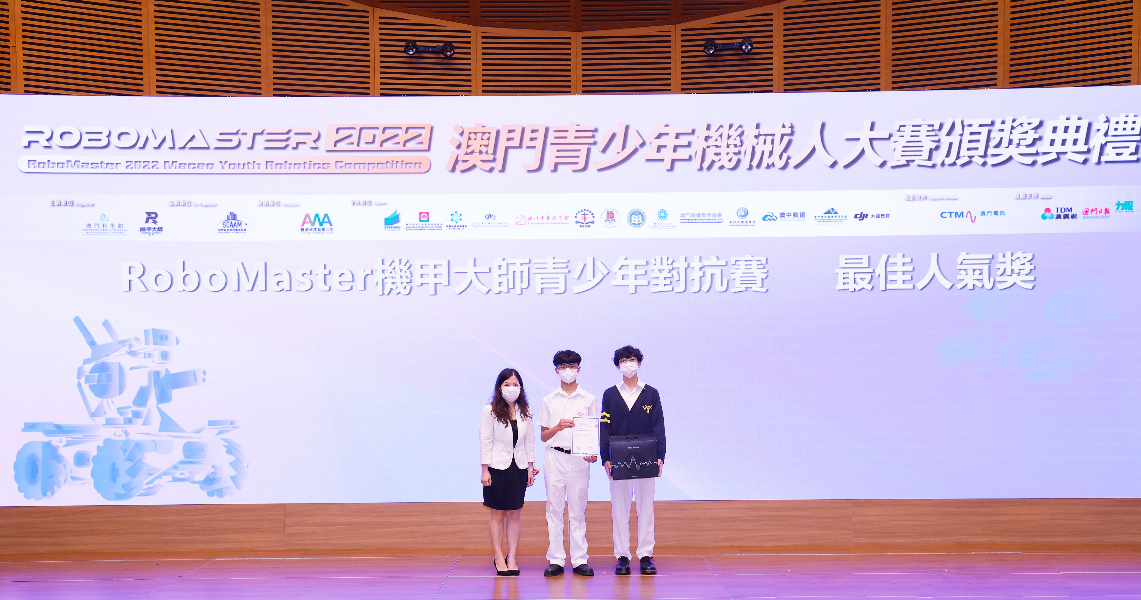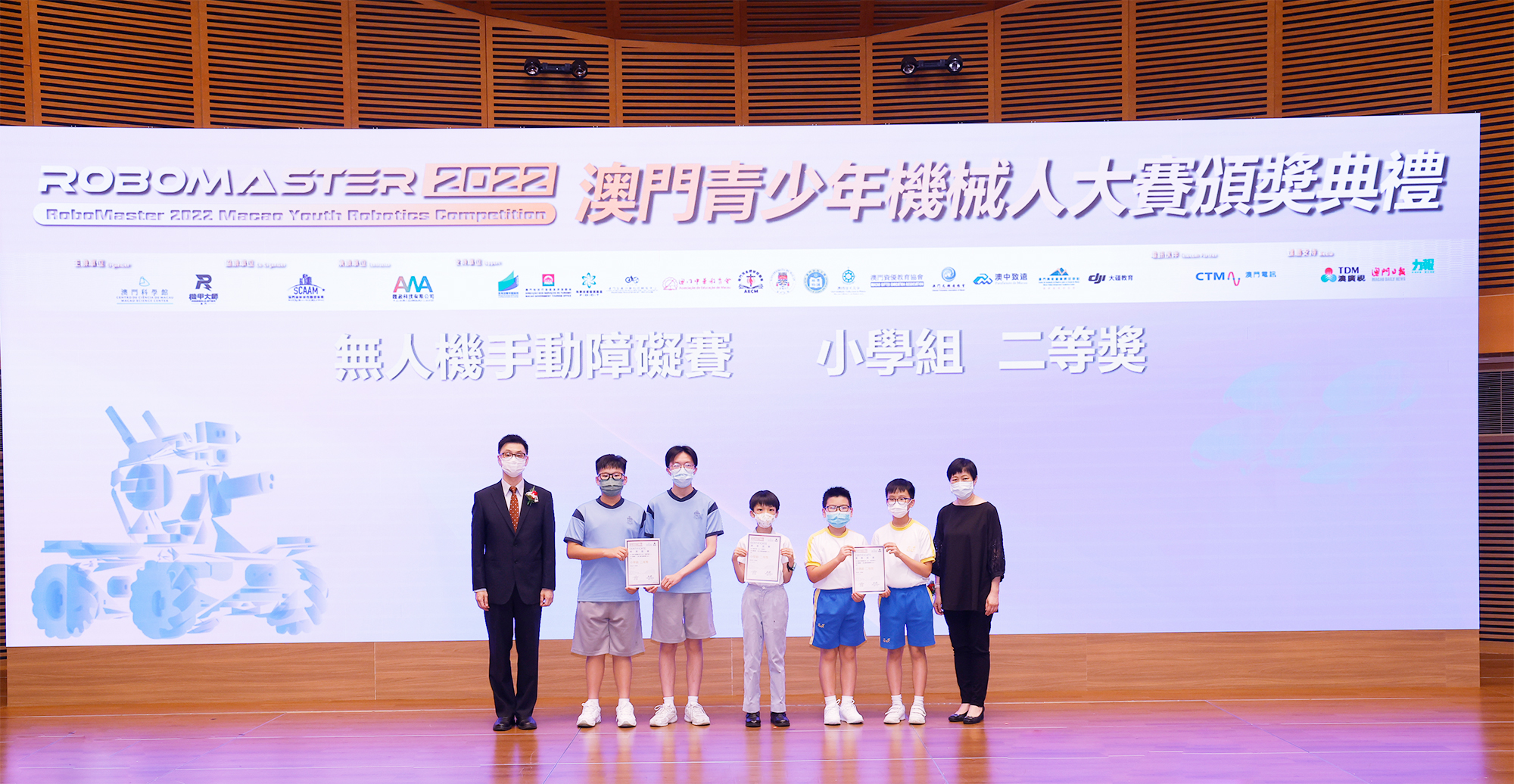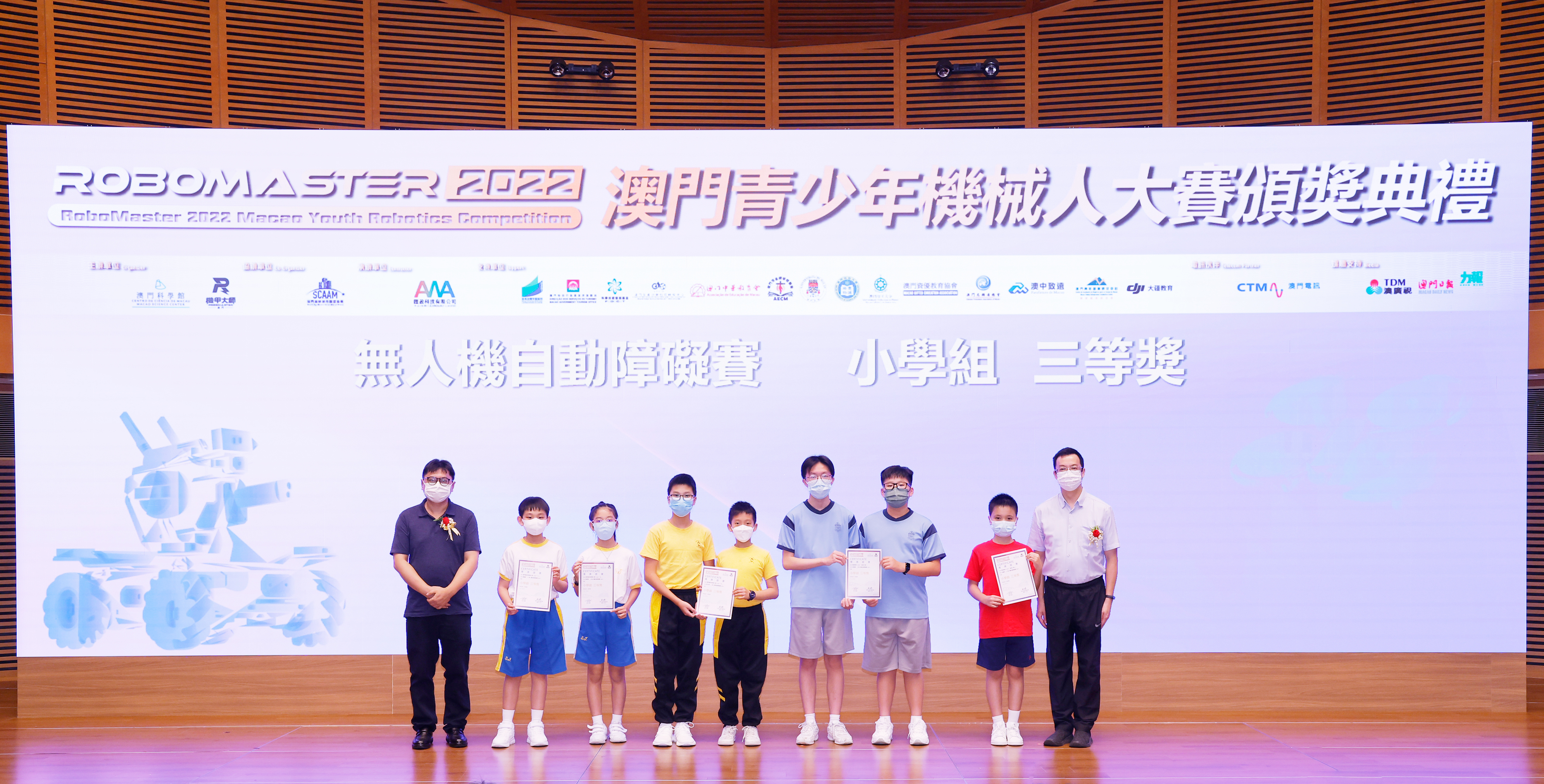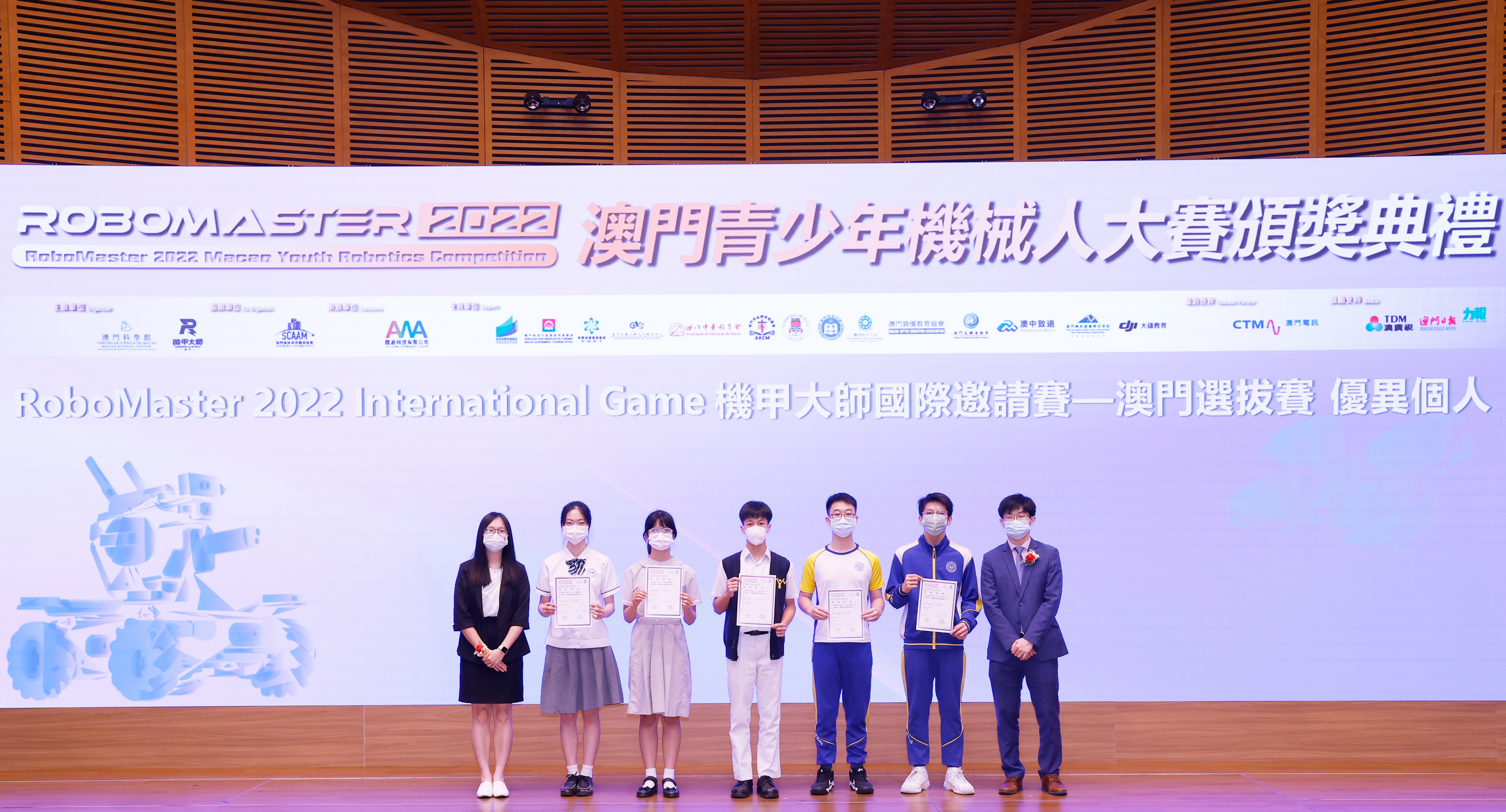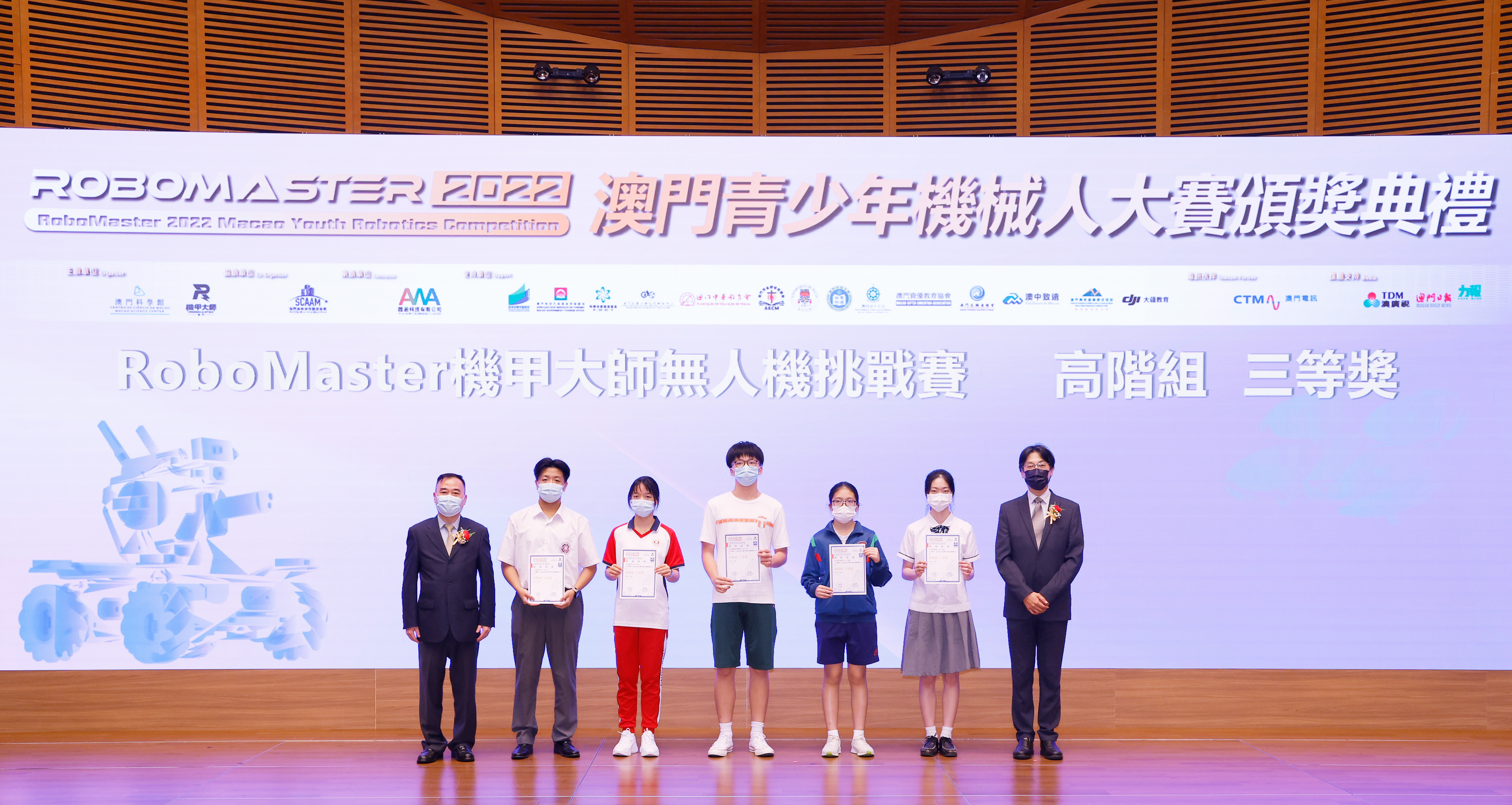 由澳門科學館和機甲大師澳門(國際)協會主辦,澳門智慧城市聯盟協會協辦,匯盈科技有限公司承辦的「RoboMaster 2022 澳門青少年機械人大賽」,在多個政府部門、機構和公司的大力支持,以及在澳門一眾學校領導及師生的積極參與和配合下,已於6月5日順利結束,並於今日在澳門科學館會議廳圓滿舉行頒獎典禮暨成果展,共23間學校約150名師生代表及優秀志願者等出席參與。本次賽事超過20間學校, 700余學生及老師參與不同賽項的競技中,通過比賽的形式為參賽隊員搭建一個全面機械人技術交流的平臺,形成濃厚的學術氛圍,他們在比賽中成長,在實踐中進步,並讓機械人競技和工程師文化進入大眾的視野,啟發更多懷有科技夢想的個人或群體,為地區科技創新發展助力。