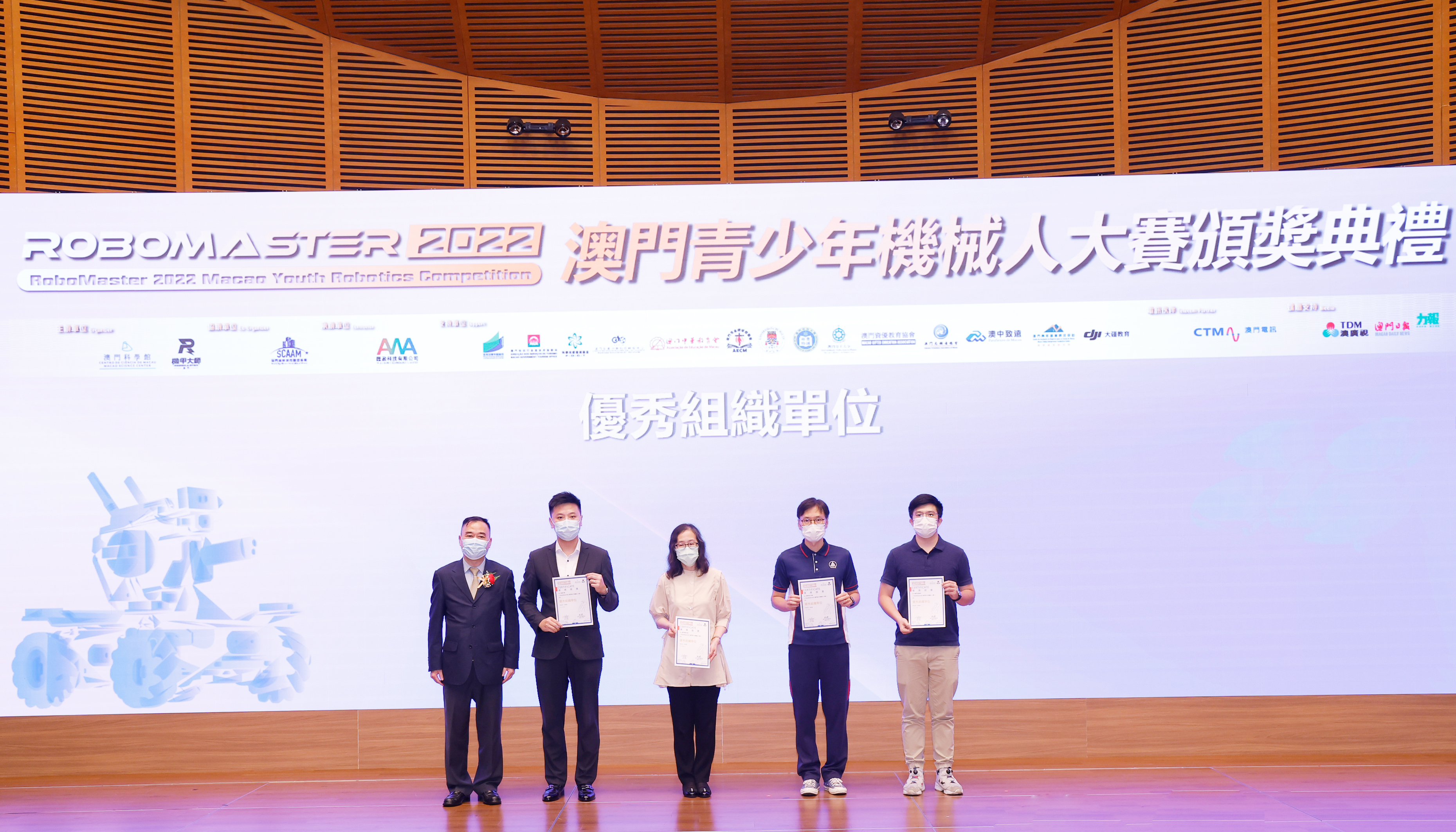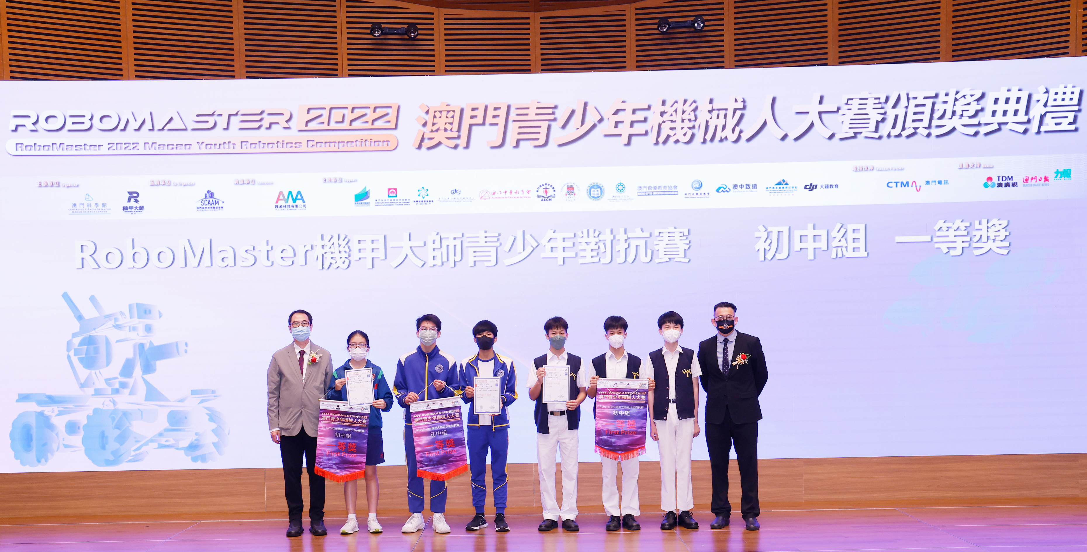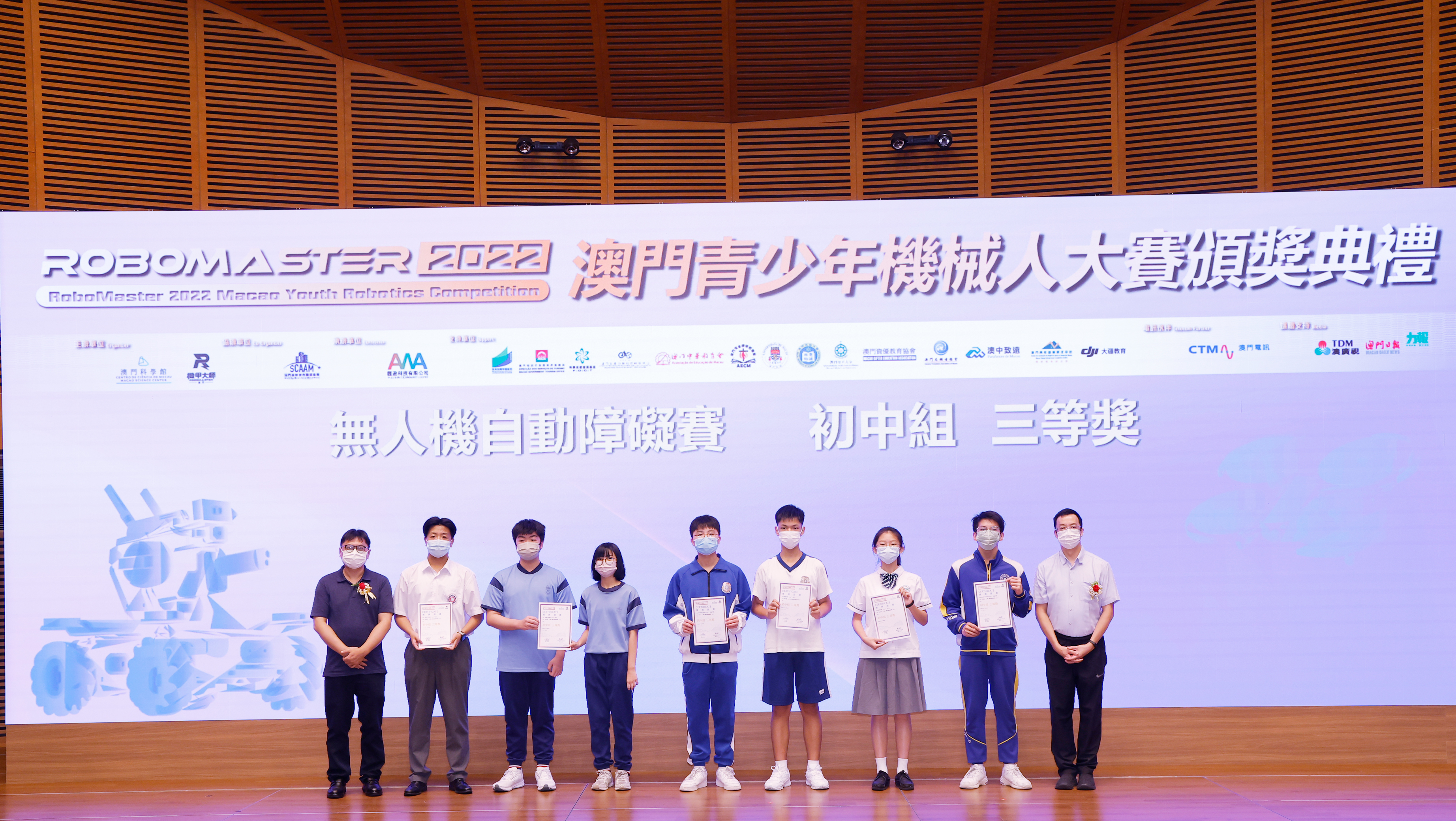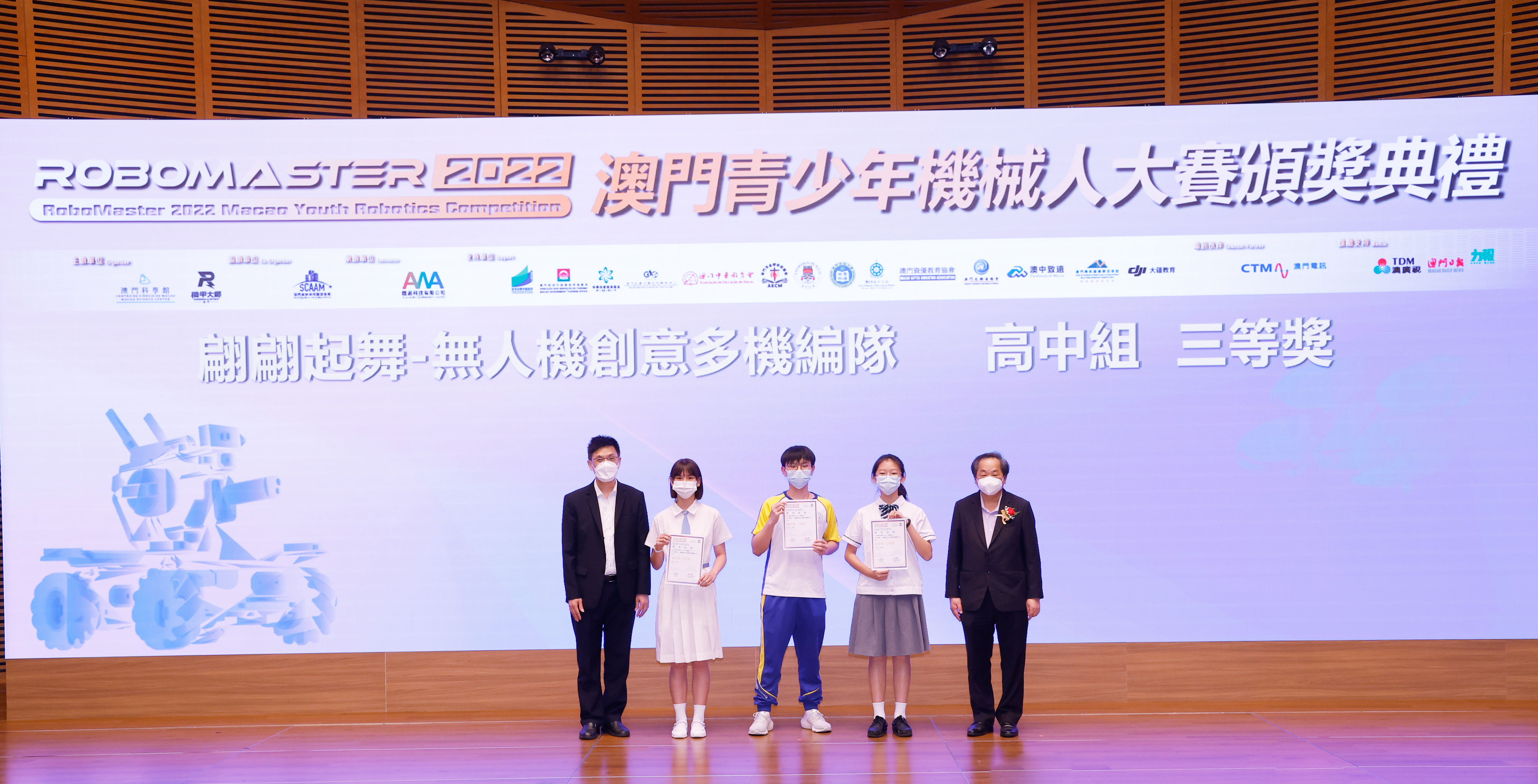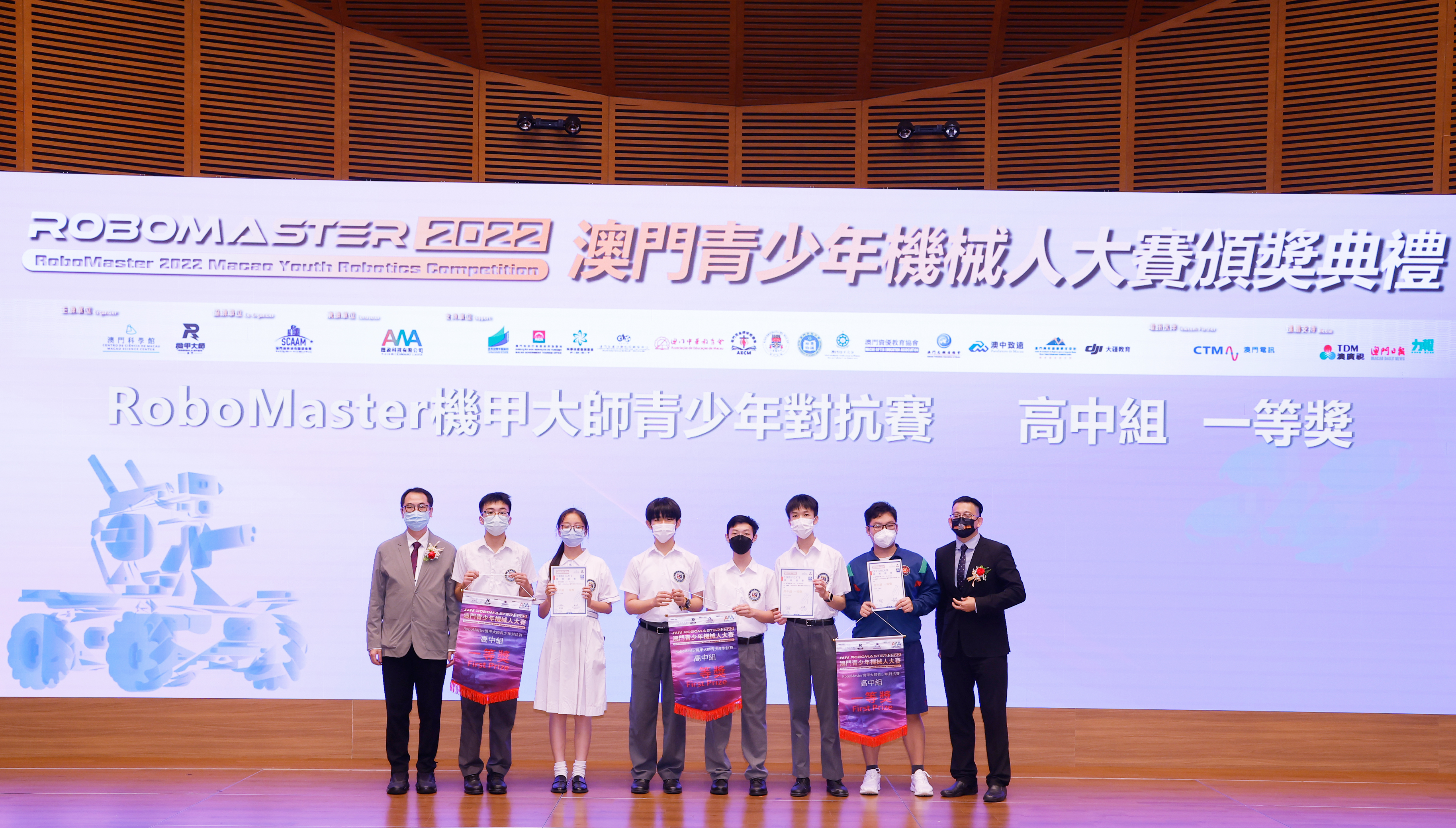 由澳門科學館和機甲大師澳門(國際)協會主辦,澳門智慧城市聯盟協會協辦,匯盈科技有限公司承辦的「RoboMaster 2022 澳門青少年機械人大賽」,在多個政府部門、機構和公司的大力支持,以及在澳門一眾學校領導及師生的積極參與和配合下,已於6月5日順利結束,並於今日在澳門科學館會議廳圓滿舉行頒獎典禮暨成果展,共23間學校約150名師生代表及優秀志願者等出席參與。本次賽事超過20間學校, 700余學生及老師參與不同賽項的競技中,通過比賽的形式為參賽隊員搭建一個全面機械人技術交流的平臺,形成濃厚的學術氛圍,他們在比賽中成長,在實踐中進步,並讓機械人競技和工程師文化進入大眾的視野,啟發更多懷有科技夢想的個人或群體,為地區科技創新發展助力。