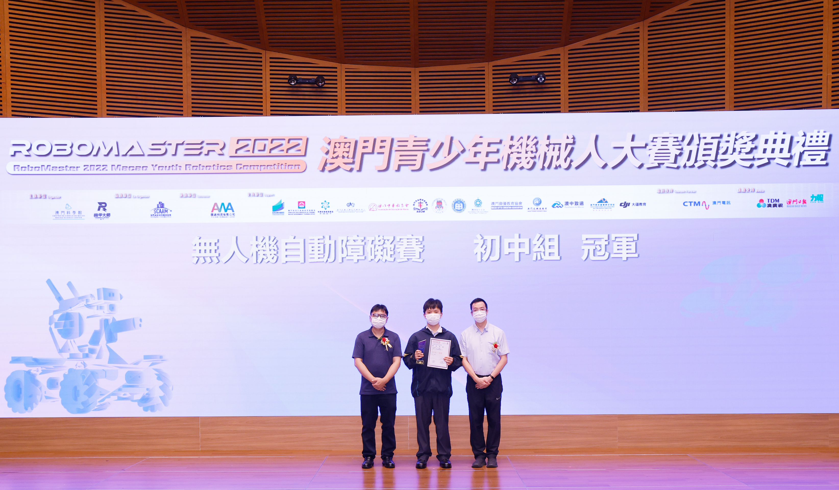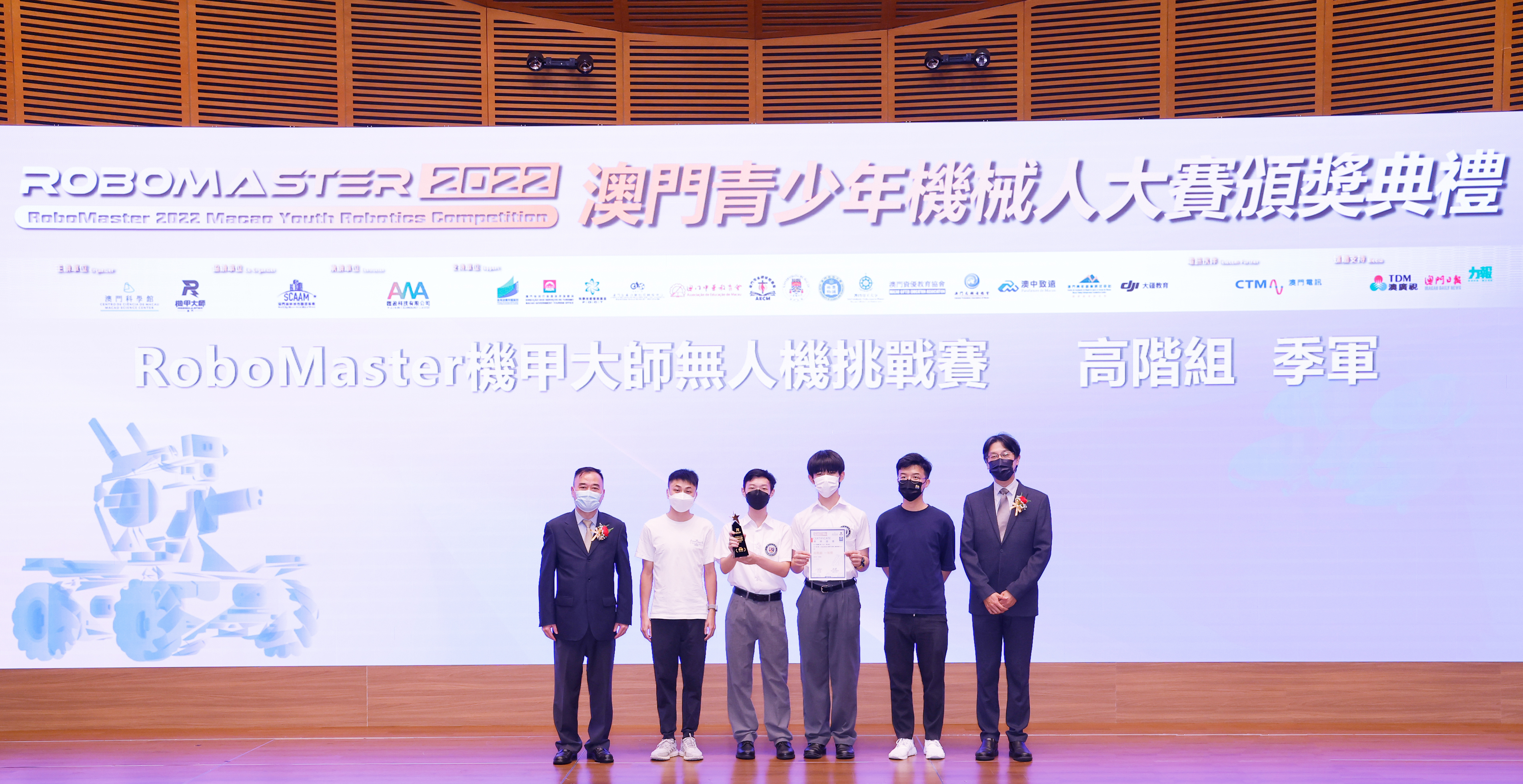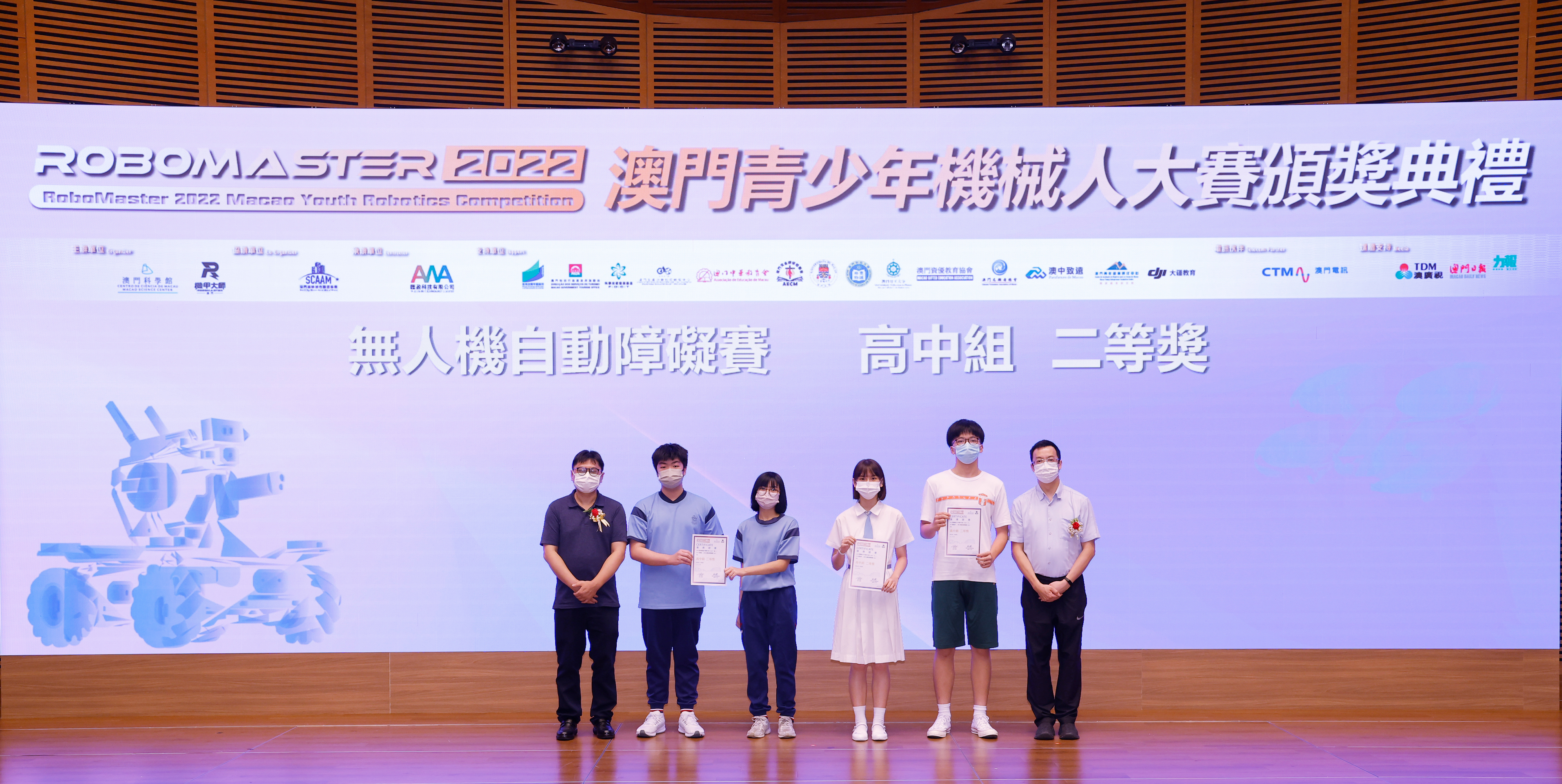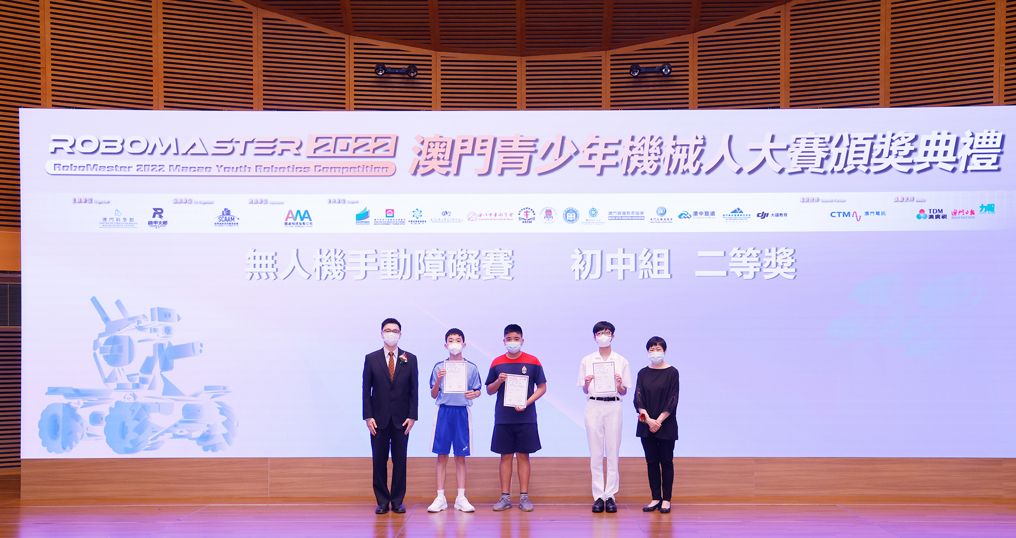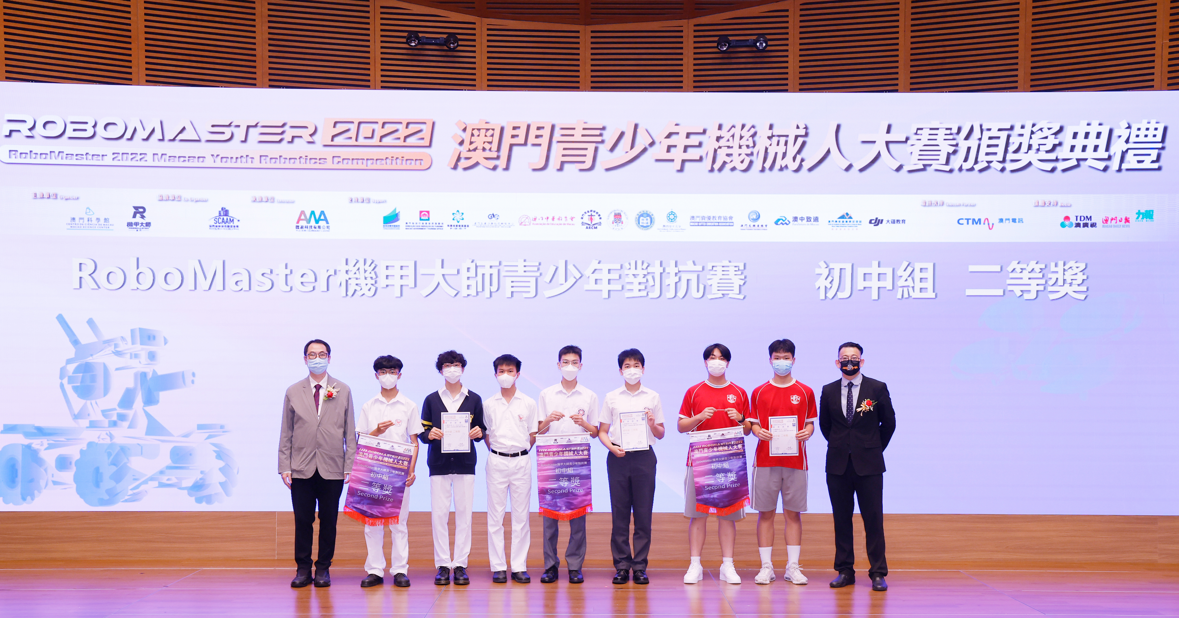 由澳門科學館和機甲大師澳門(國際)協會主辦,澳門智慧城市聯盟協會協辦,匯盈科技有限公司承辦的「RoboMaster 2022 澳門青少年機械人大賽」,在多個政府部門、機構和公司的大力支持,以及在澳門一眾學校領導及師生的積極參與和配合下,已於6月5日順利結束,並於今日在澳門科學館會議廳圓滿舉行頒獎典禮暨成果展,共23間學校約150名師生代表及優秀志願者等出席參與。本次賽事超過20間學校, 700余學生及老師參與不同賽項的競技中,通過比賽的形式為參賽隊員搭建一個全面機械人技術交流的平臺,形成濃厚的學術氛圍,他們在比賽中成長,在實踐中進步,並讓機械人競技和工程師文化進入大眾的視野,啟發更多懷有科技夢想的個人或群體,為地區科技創新發展助力。