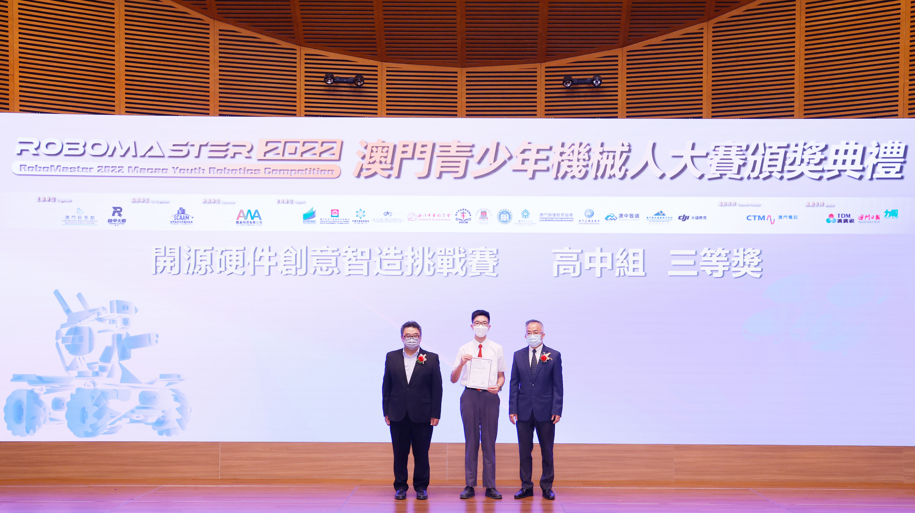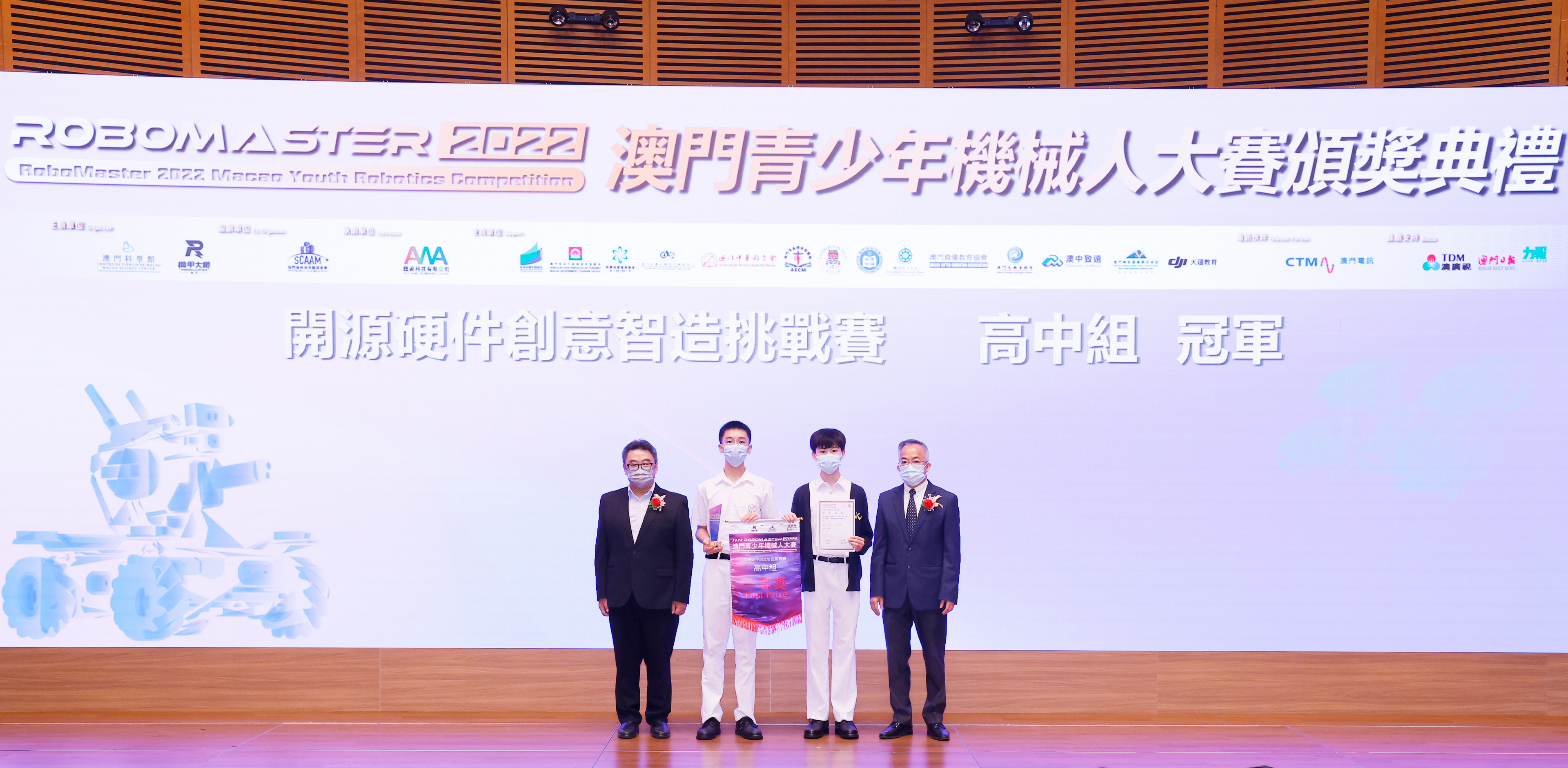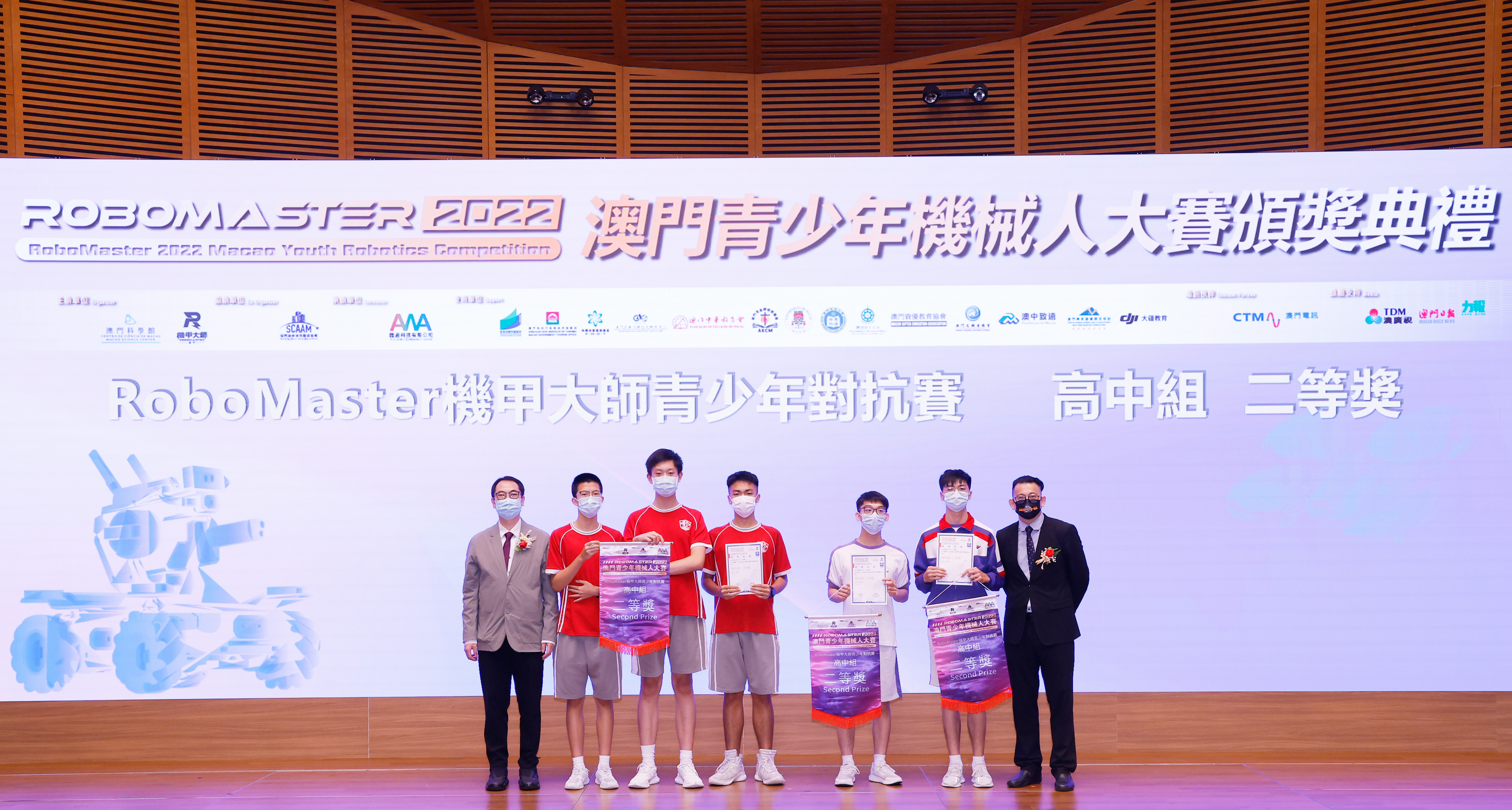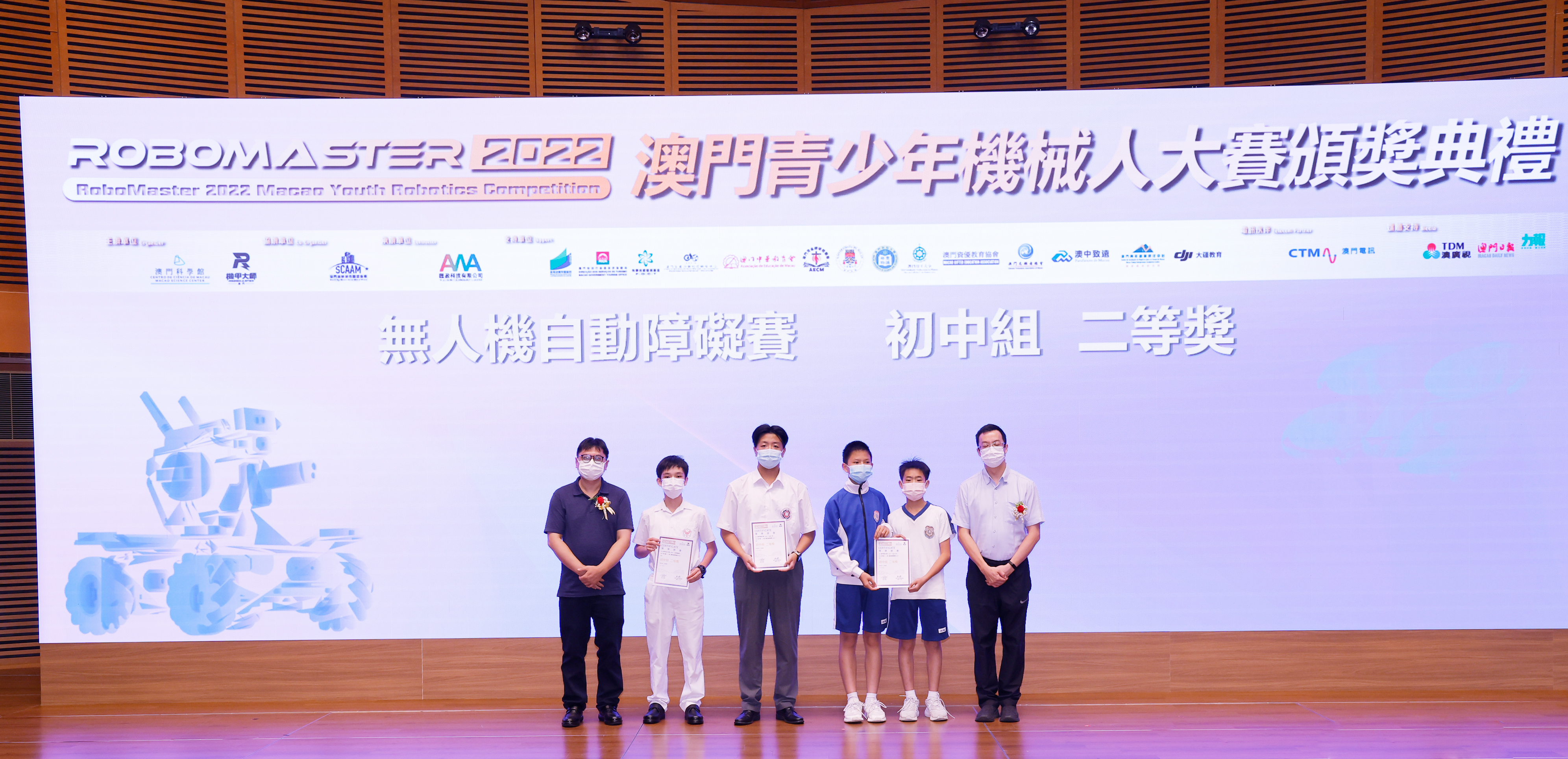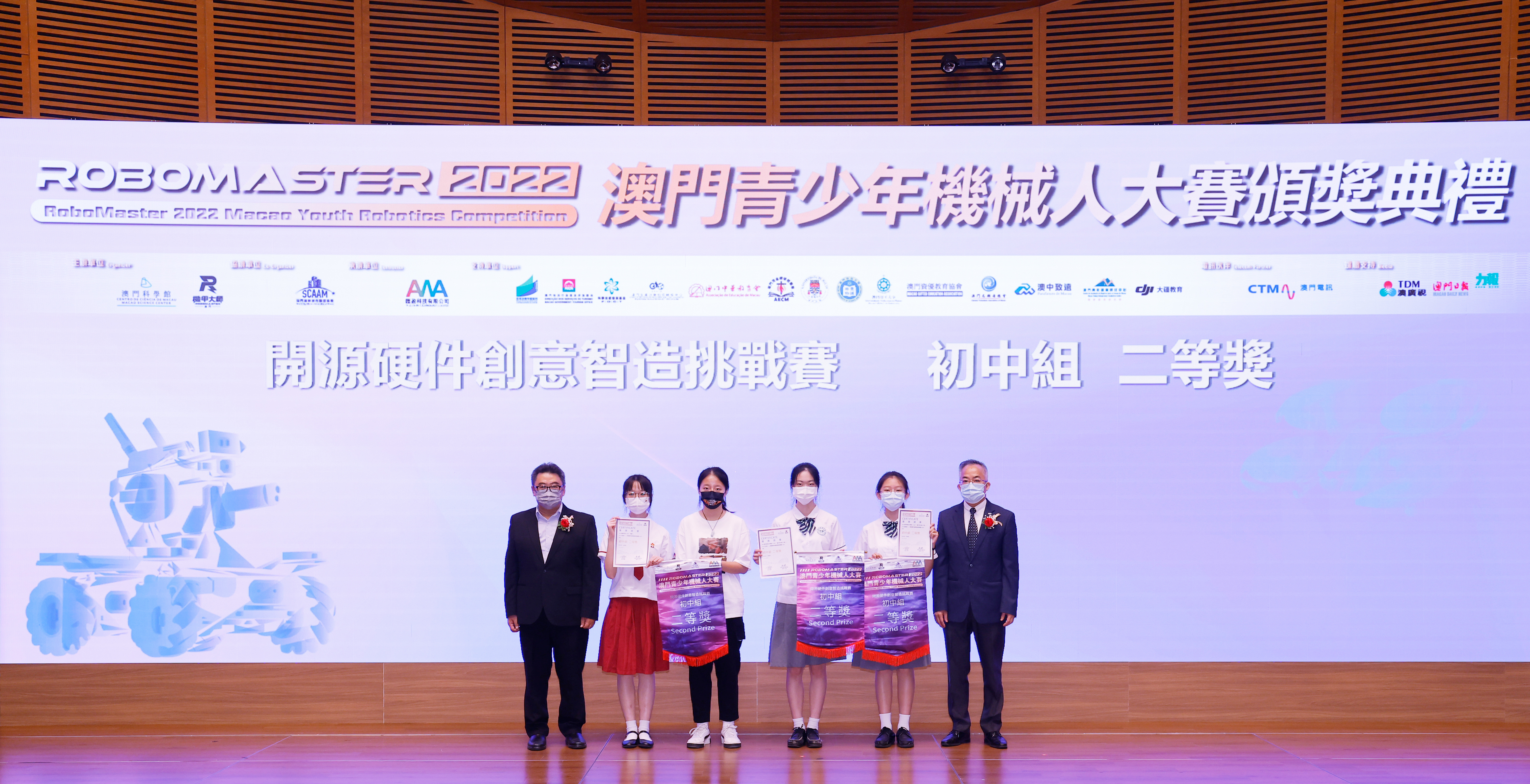 由澳門科學館和機甲大師澳門(國際)協會主辦,澳門智慧城市聯盟協會協辦,匯盈科技有限公司承辦的「RoboMaster 2022 澳門青少年機械人大賽」,在多個政府部門、機構和公司的大力支持,以及在澳門一眾學校領導及師生的積極參與和配合下,已於6月5日順利結束,並於今日在澳門科學館會議廳圓滿舉行頒獎典禮暨成果展,共23間學校約150名師生代表及優秀志願者等出席參與。本次賽事超過20間學校, 700余學生及老師參與不同賽項的競技中,通過比賽的形式為參賽隊員搭建一個全面機械人技術交流的平臺,形成濃厚的學術氛圍,他們在比賽中成長,在實踐中進步,並讓機械人競技和工程師文化進入大眾的視野,啟發更多懷有科技夢想的個人或群體,為地區科技創新發展助力。
