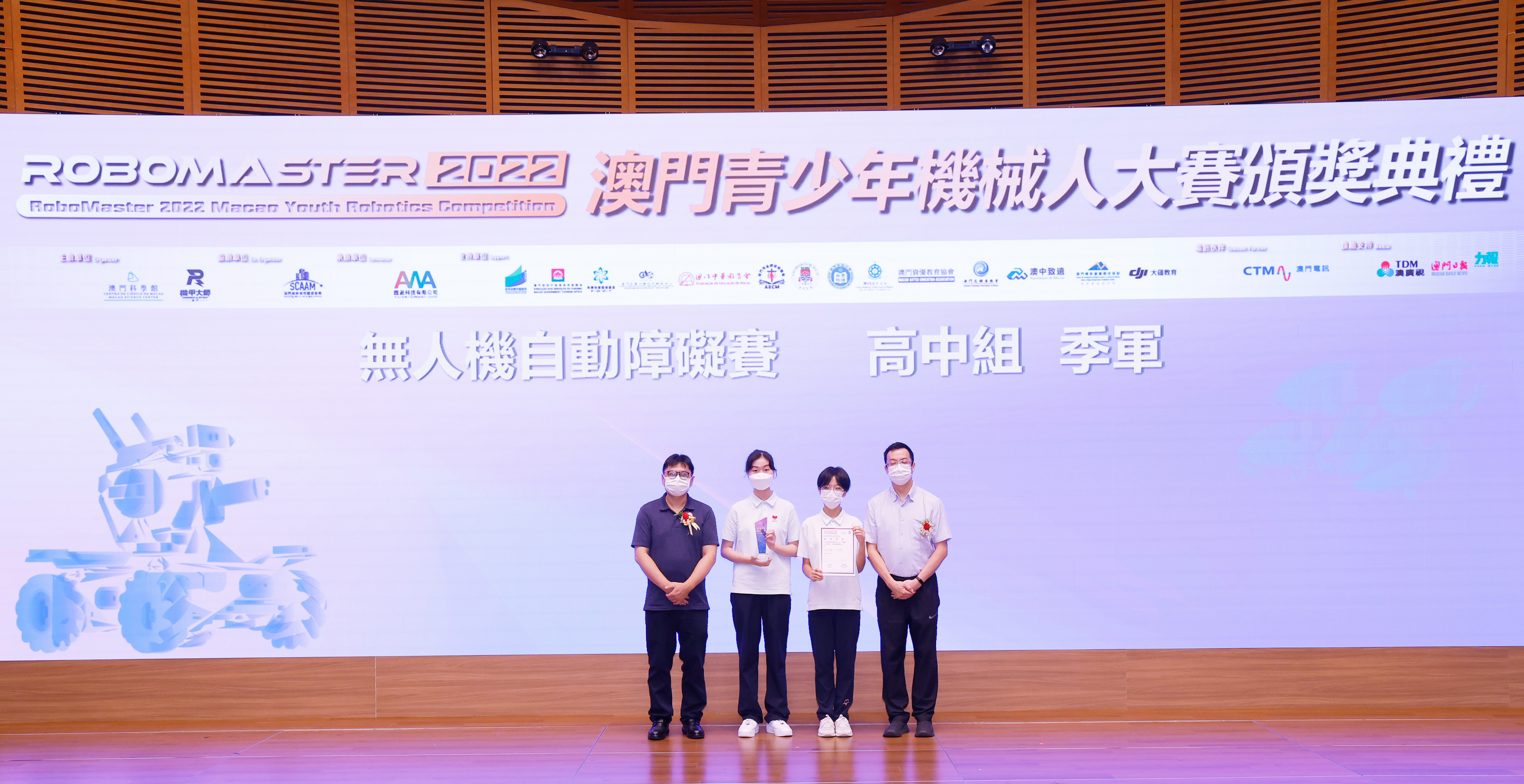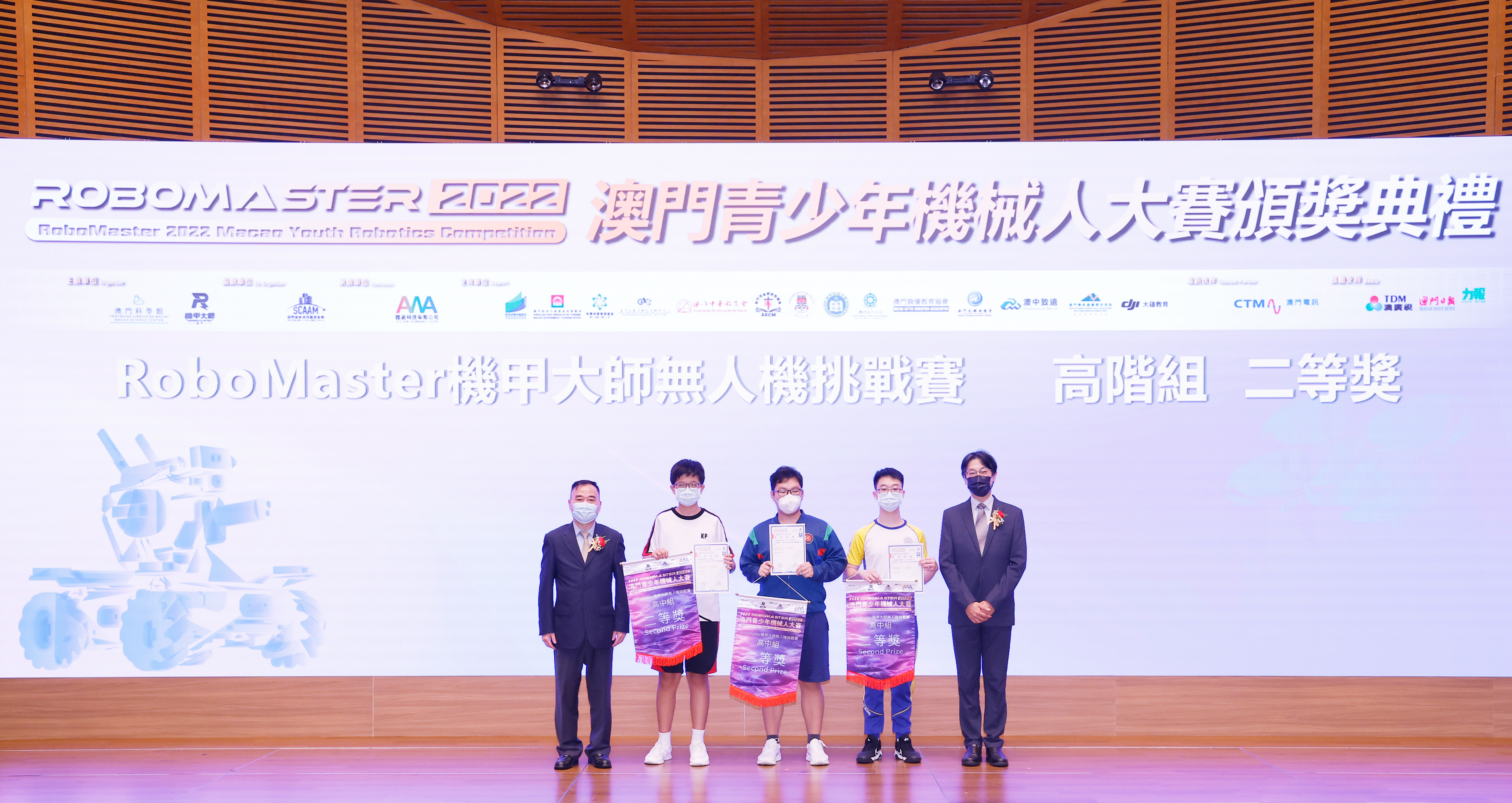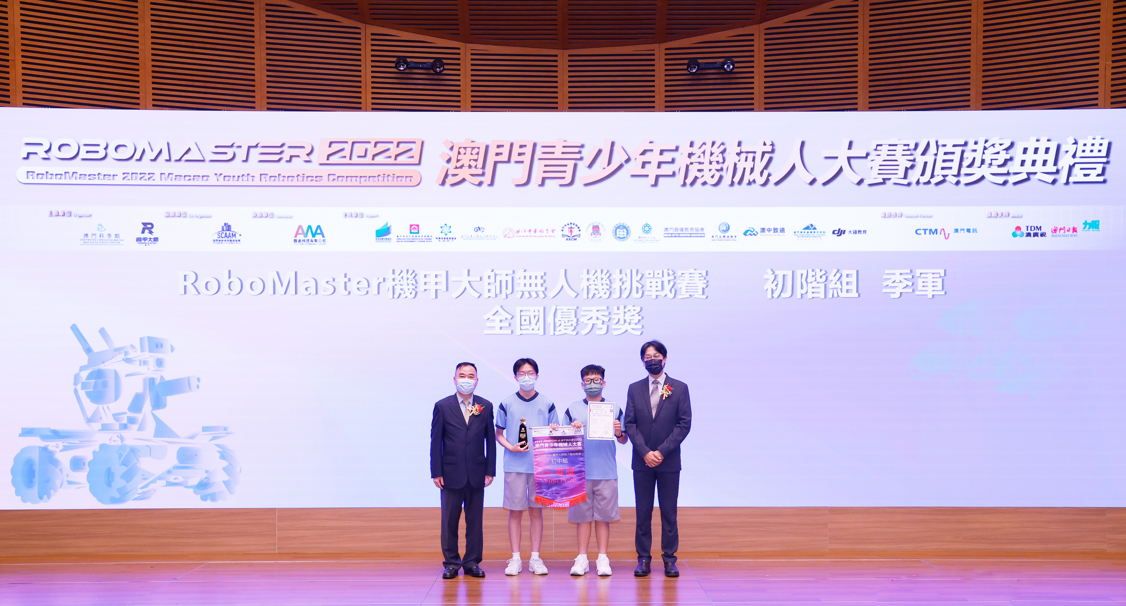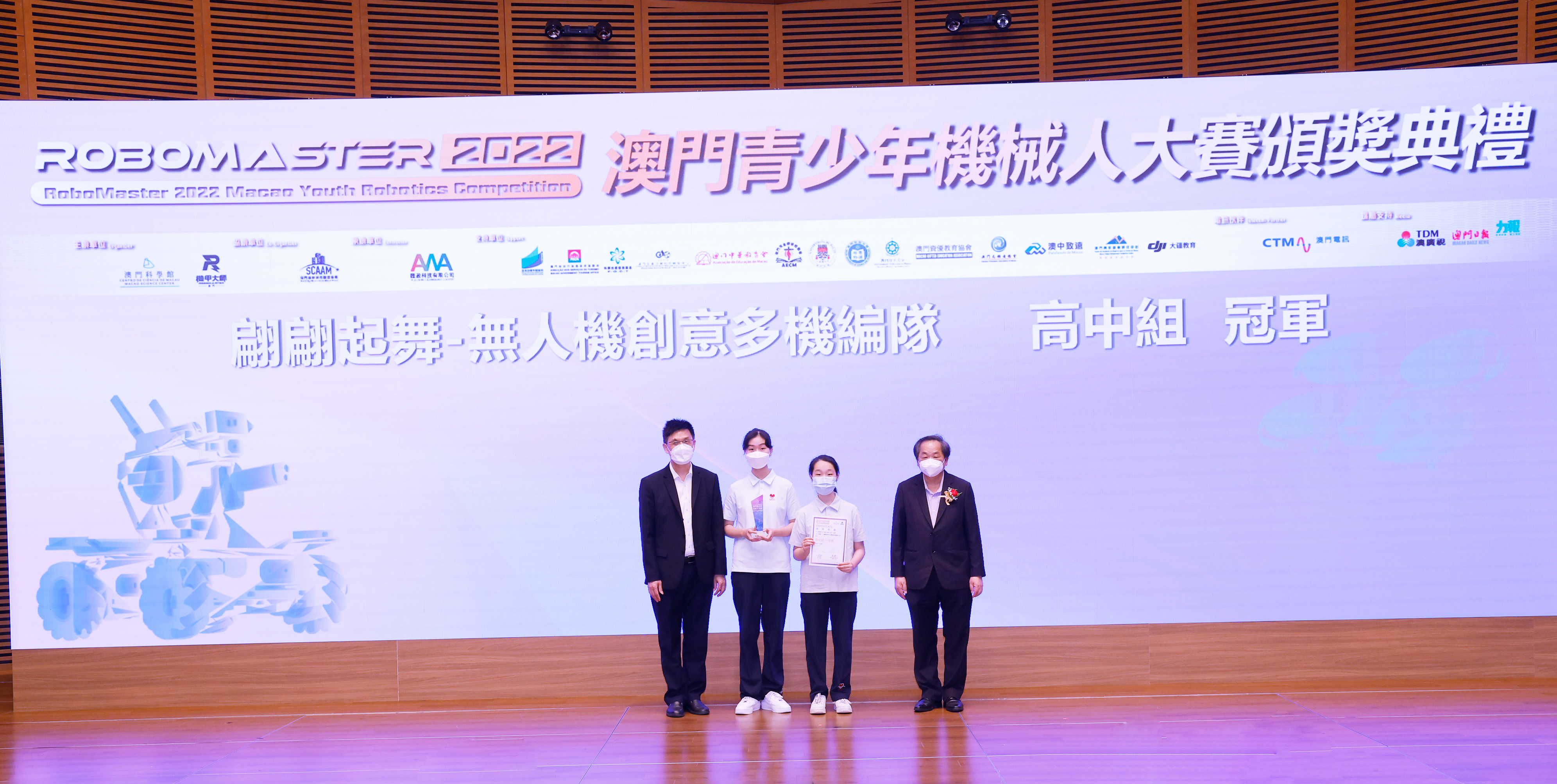 澳門特別行政區政府教育及青年發展局學生廳廳長 陳旭偉 (圖左) 和澳門特別行政區 政府旅遊局資訊處處長 蔡昌鴻(圖右)為「RoboMaster 機甲大師無人機挑戰賽」初中組和高中組獲獎學生頒獎