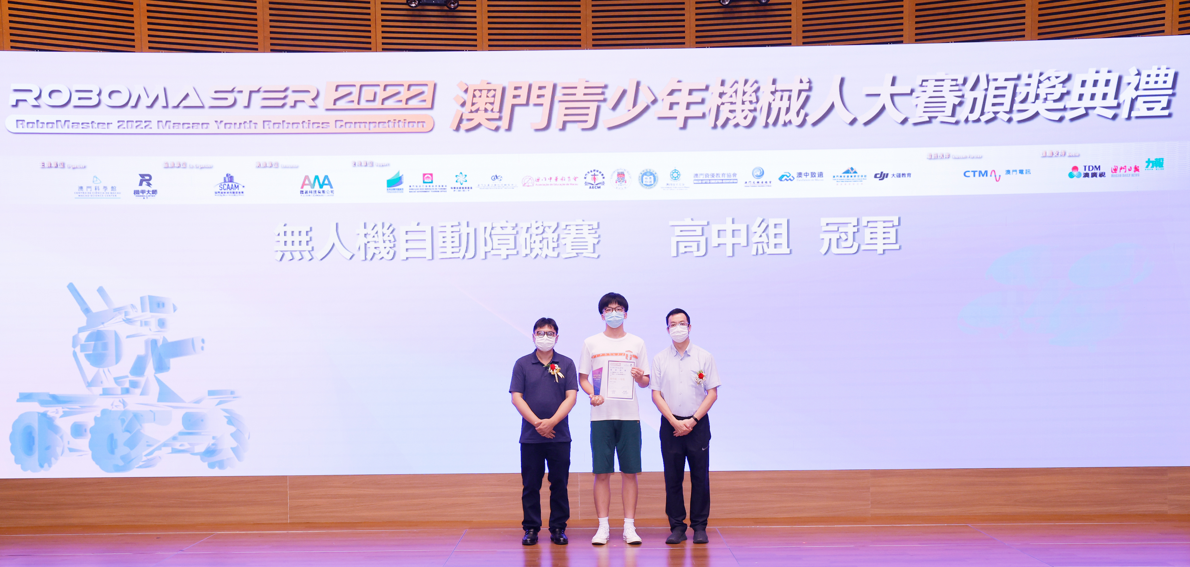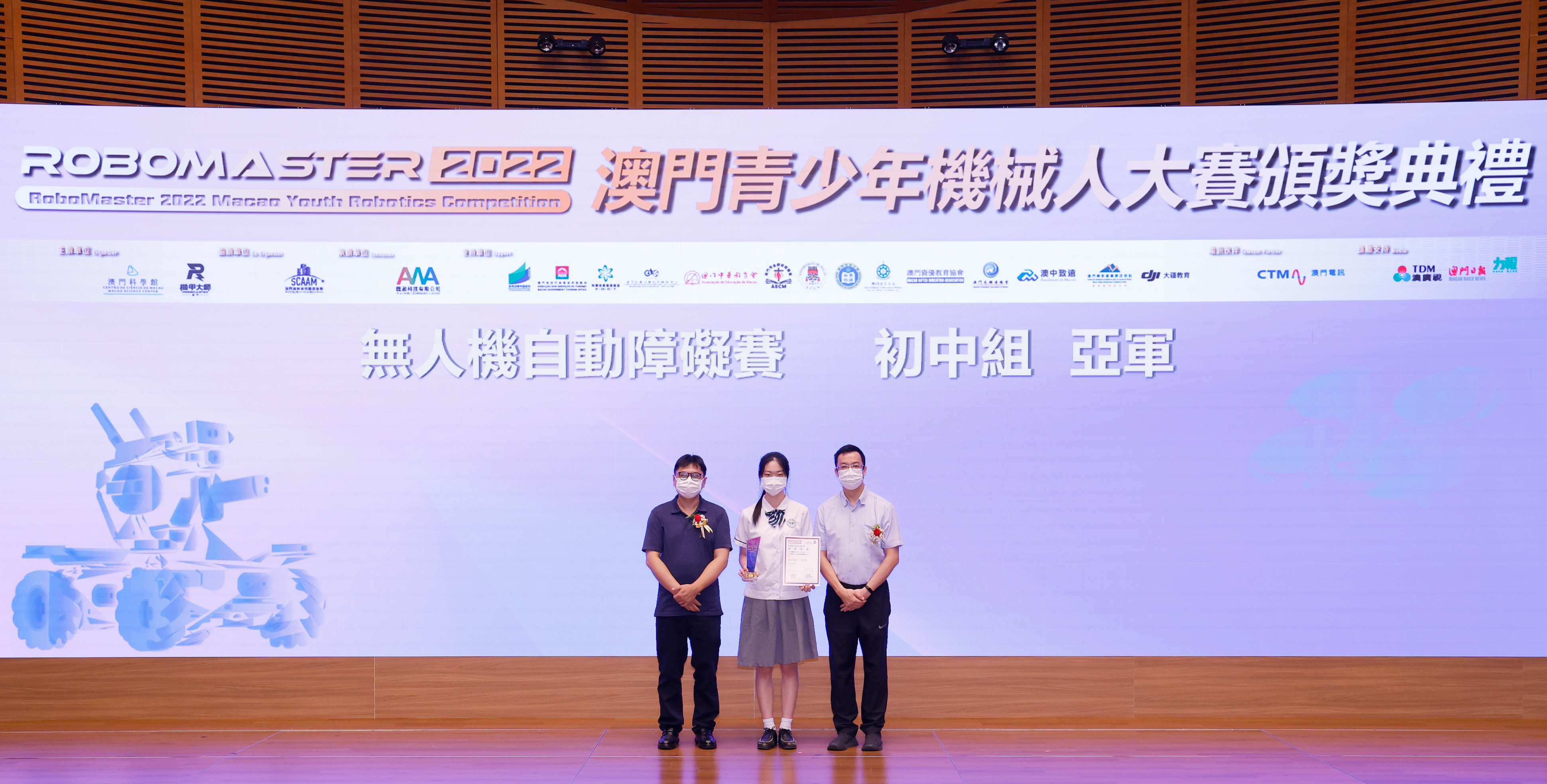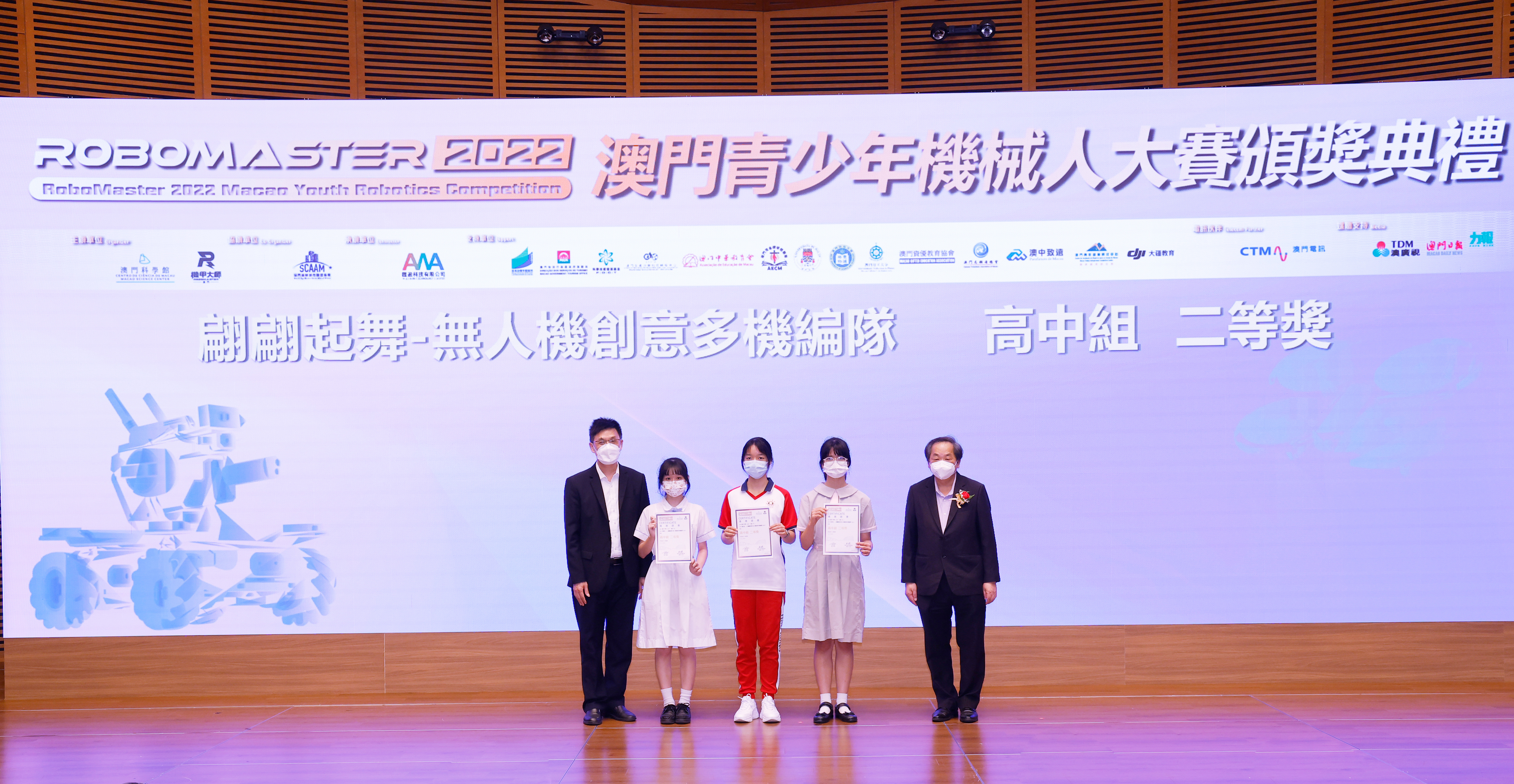 澳門特別行政區政府教育及青年發展局學生廳廳長 陳旭偉 (圖左) 和澳門特別行政區 政府旅遊局資訊處處長 蔡昌鴻(圖右)為「RoboMaster 機甲大師無人機挑戰賽」初中組和高中組獲獎學生頒獎