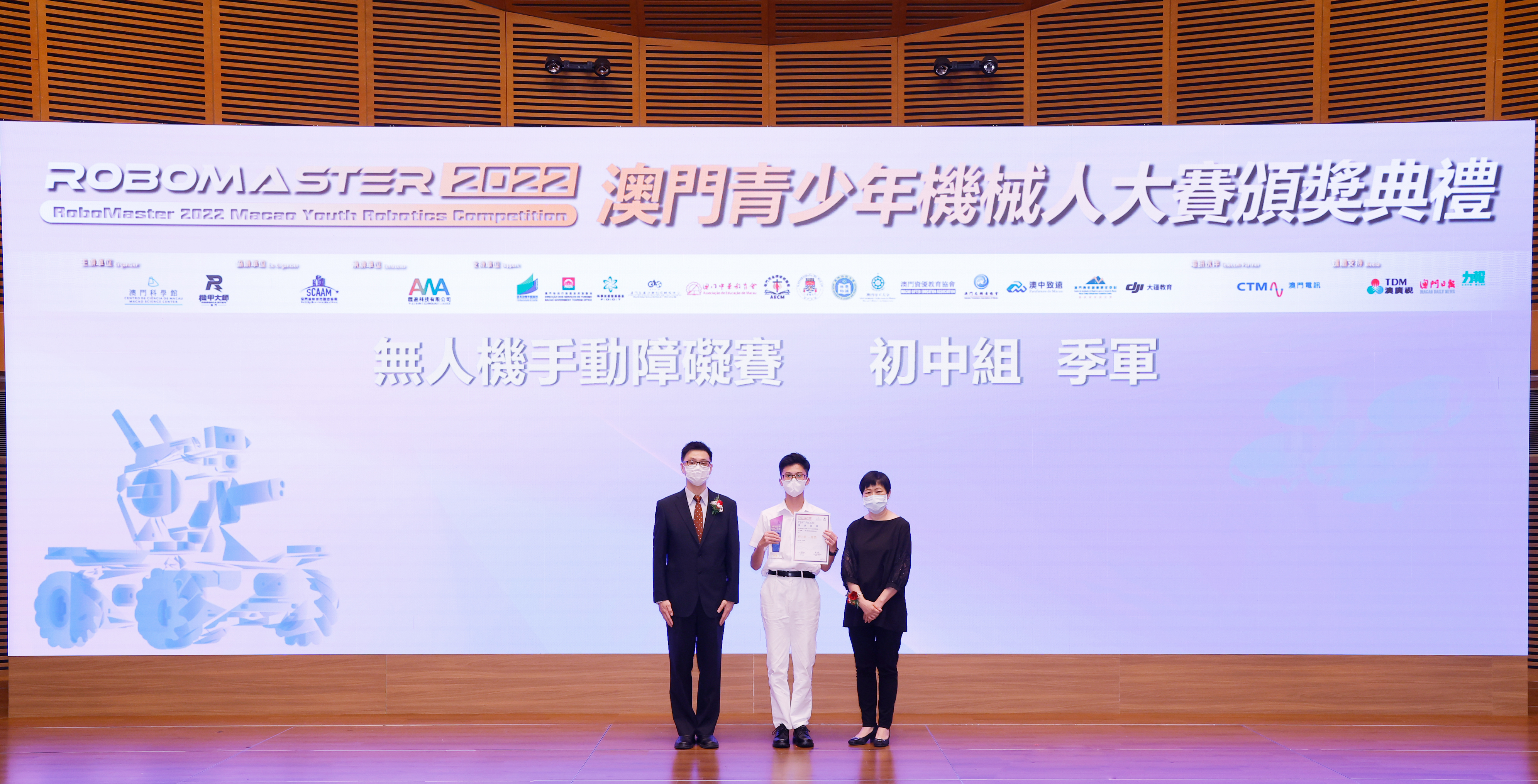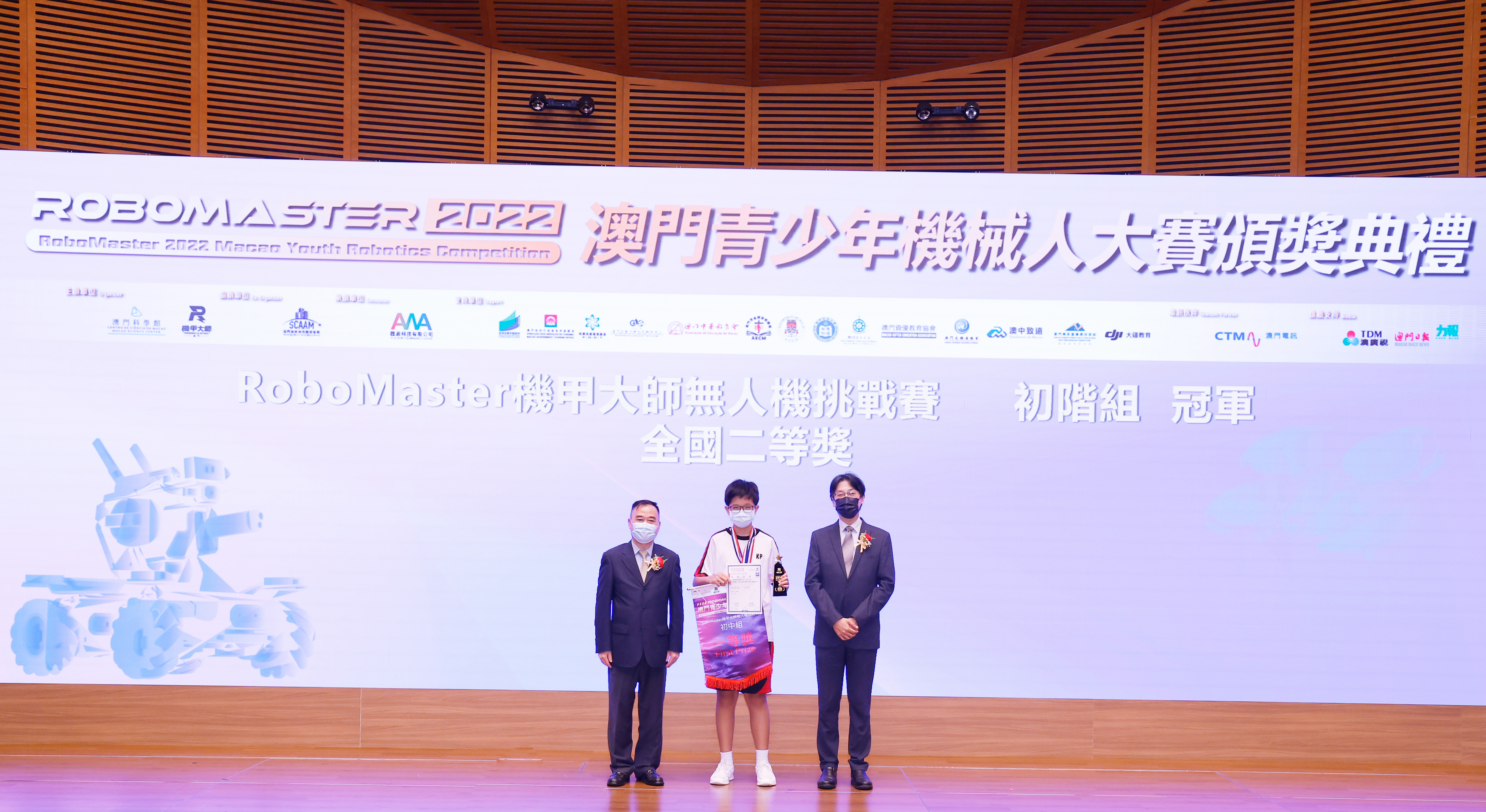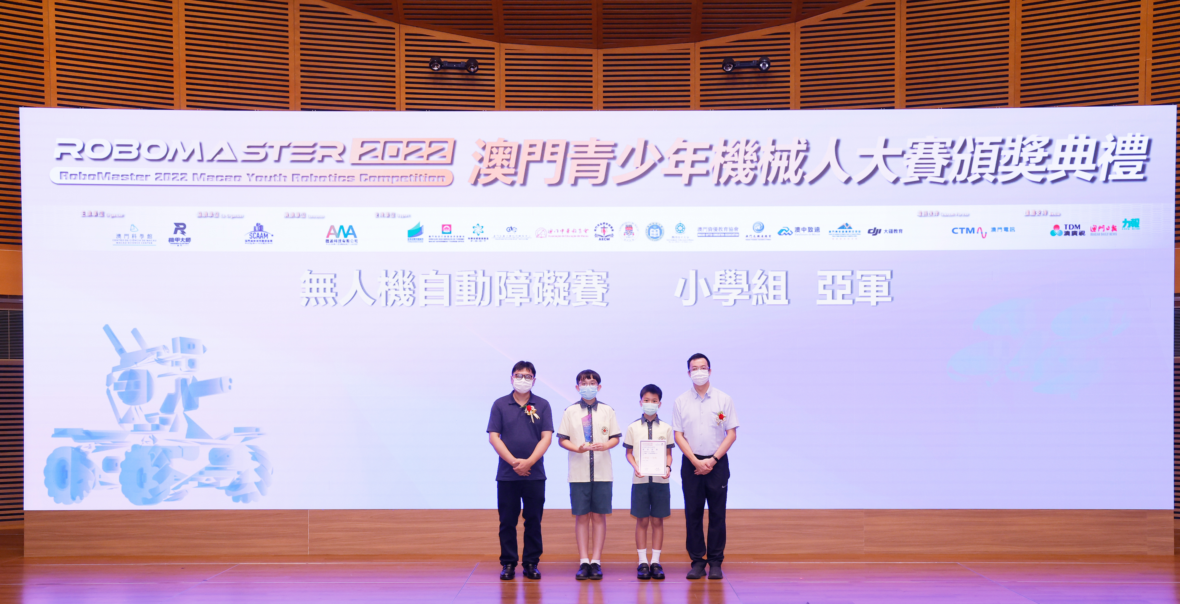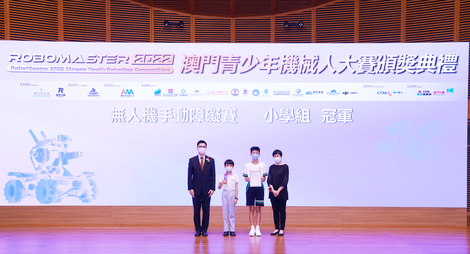 澳門特別行政區政府教育及青年發展局學生廳廳長 陳旭偉 (圖左) 和澳門特別行政區 政府旅遊局資訊處處長 蔡昌鴻(圖右)為「RoboMaster 機甲大師無人機挑戰賽」初中組和高中組獲獎學生頒獎