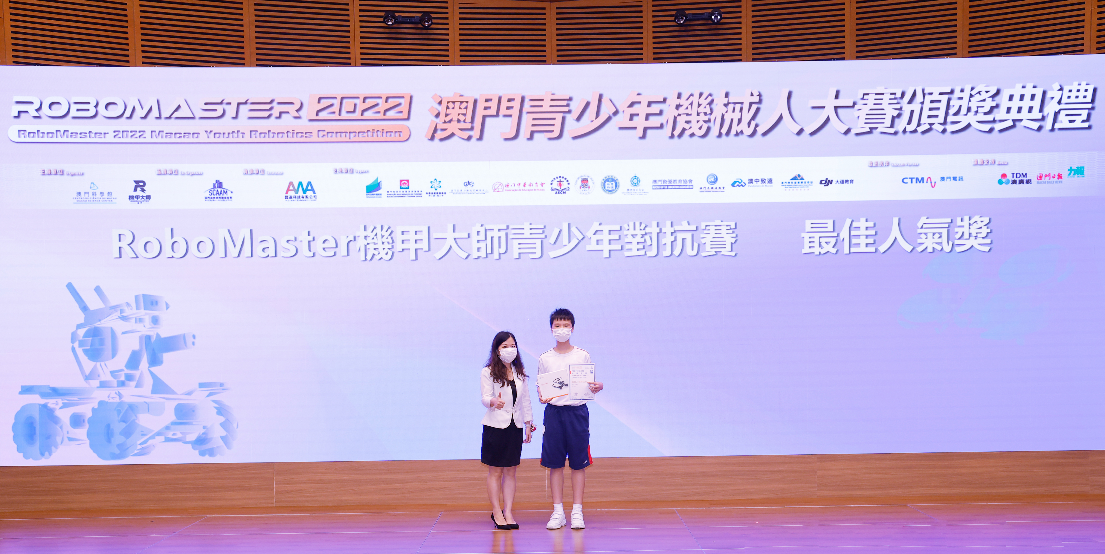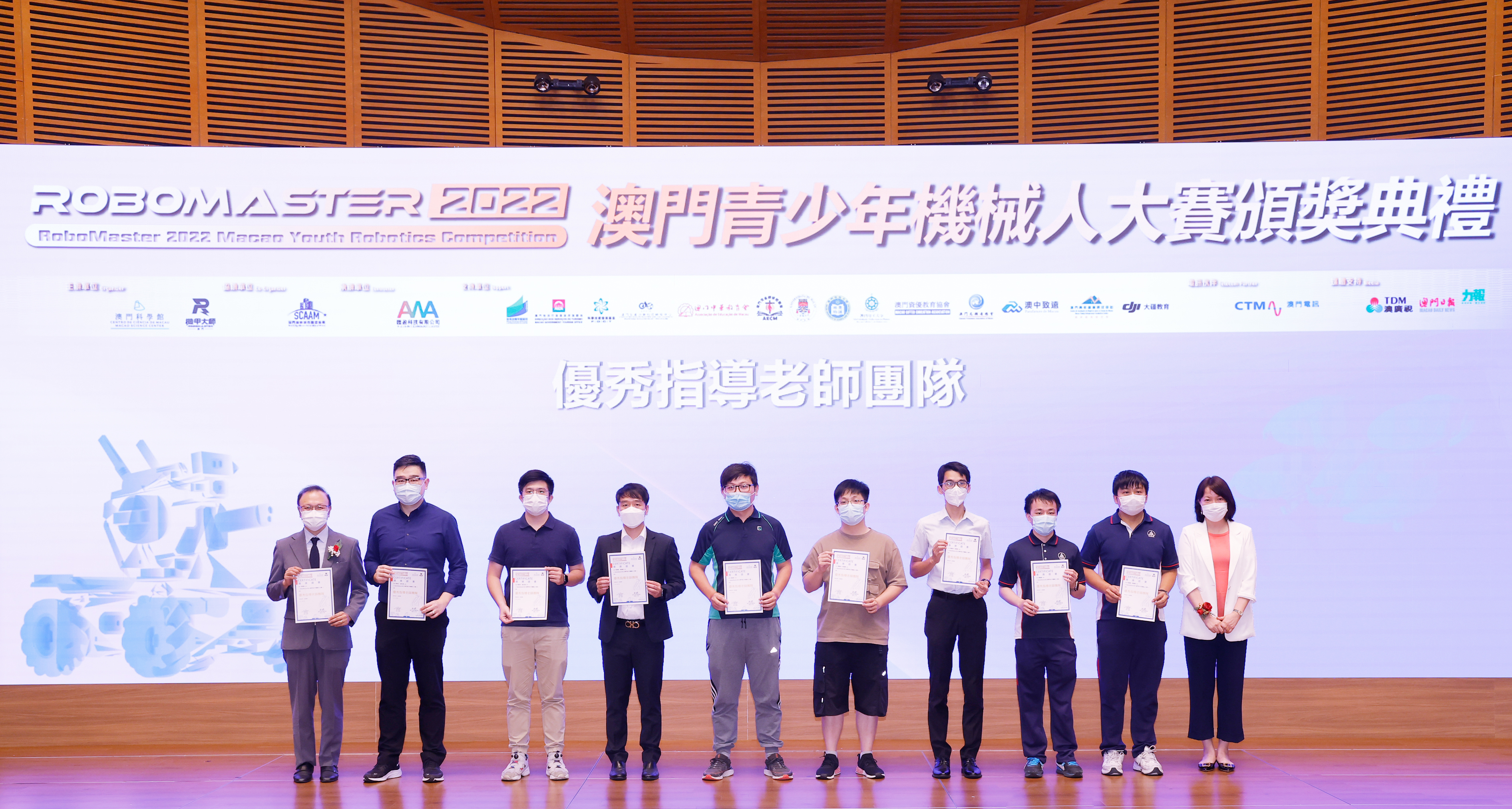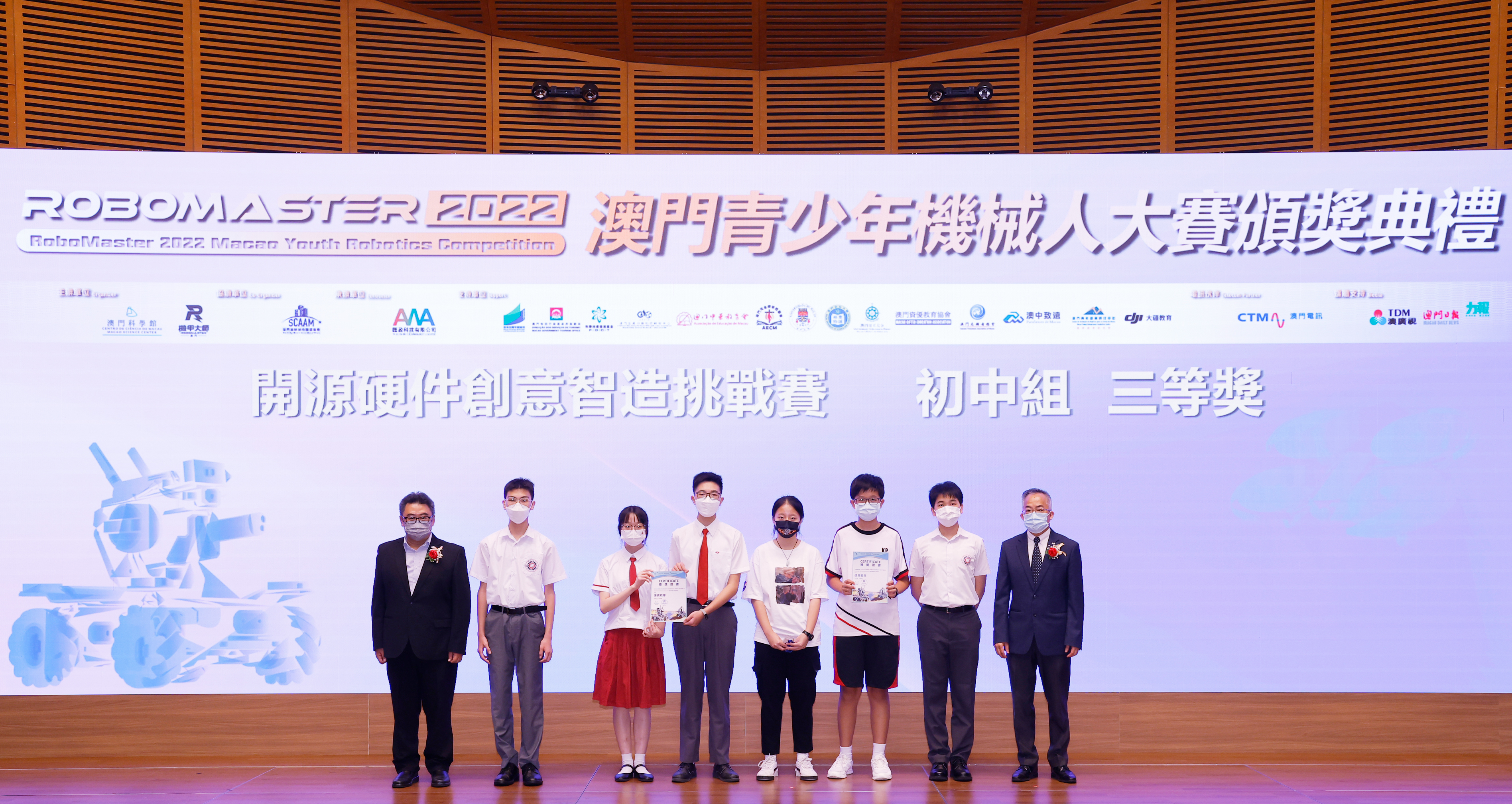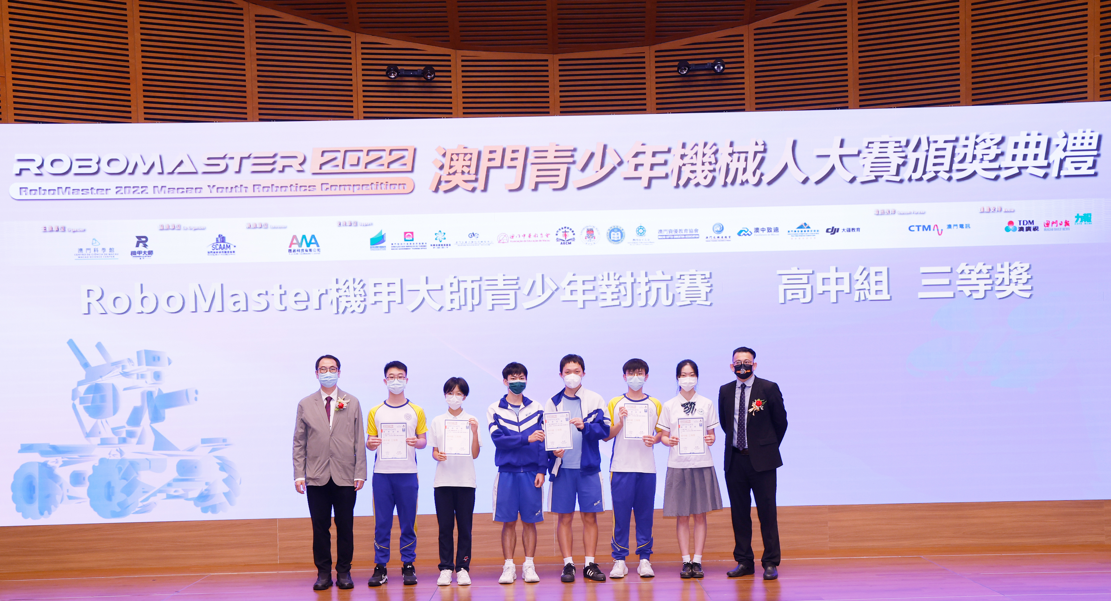 由澳門科學館和機甲大師澳門(國際)協會主辦,澳門智慧城市聯盟協會協辦,匯盈科技有限公司承辦的「RoboMaster 2022 澳門青少年機械人大賽」,在多個政府部門、機構和公司的大力支持,以及在澳門一眾學校領導及師生的積極參與和配合下,已於6月5日順利結束,並於今日在澳門科學館會議廳圓滿舉行頒獎典禮暨成果展,共23間學校約150名師生代表及優秀志願者等出席參與。本次賽事超過20間學校, 700余學生及老師參與不同賽項的競技中,通過比賽的形式為參賽隊員搭建一個全面機械人技術交流的平臺,形成濃厚的學術氛圍,他們在比賽中成長,在實踐中進步,並讓機械人競技和工程師文化進入大眾的視野,啟發更多懷有科技夢想的個人或群體,為地區科技創新發展助力。