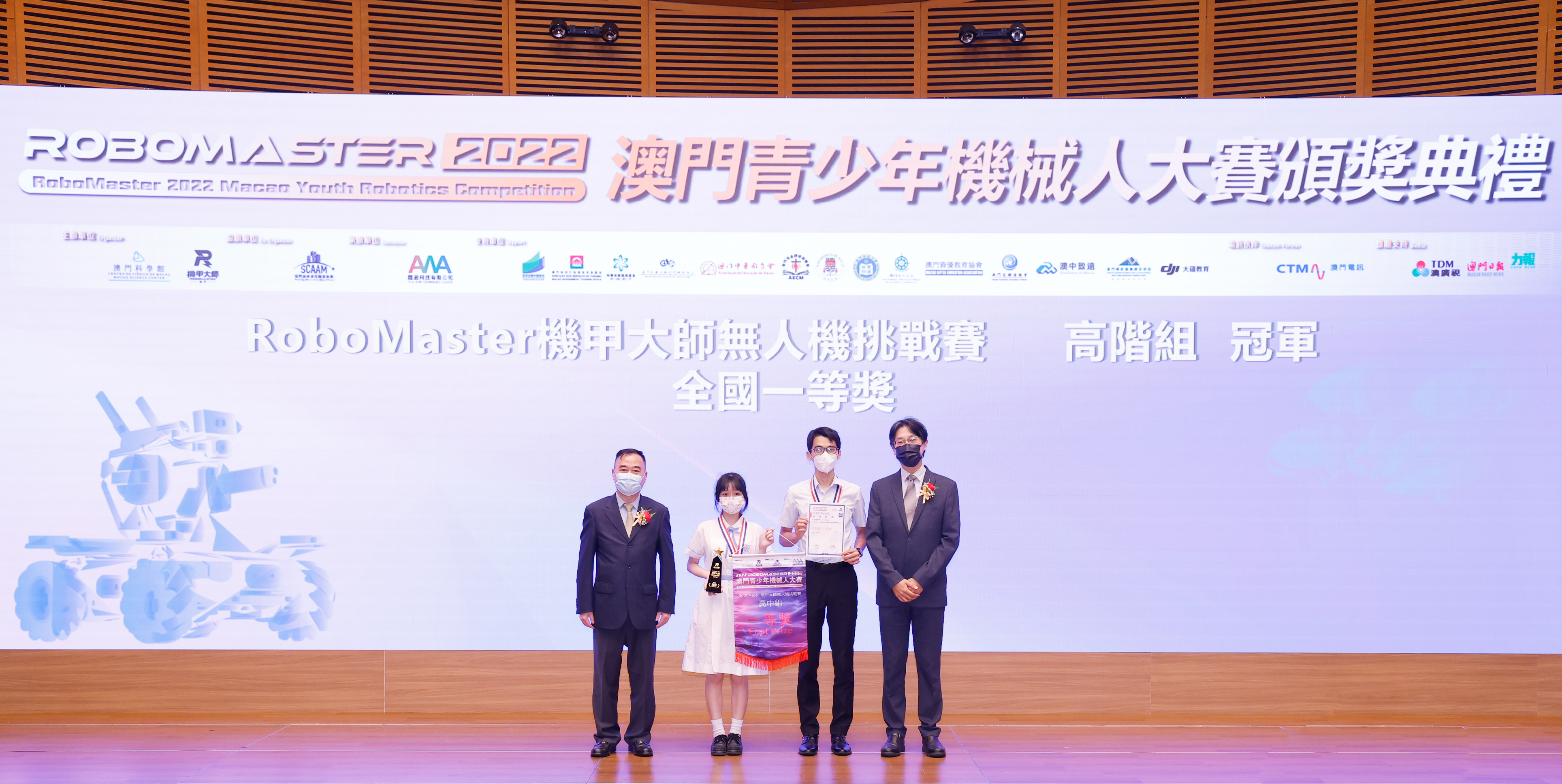 澳門特別行政區政府教育及青年發展局學生廳廳長 陳旭偉 (圖左) 和澳門特別行政區 政府旅遊局資訊處處長 蔡昌鴻(圖右)為「RoboMaster 機甲大師無人機挑戰賽」初中組和高中組獲獎學生頒獎